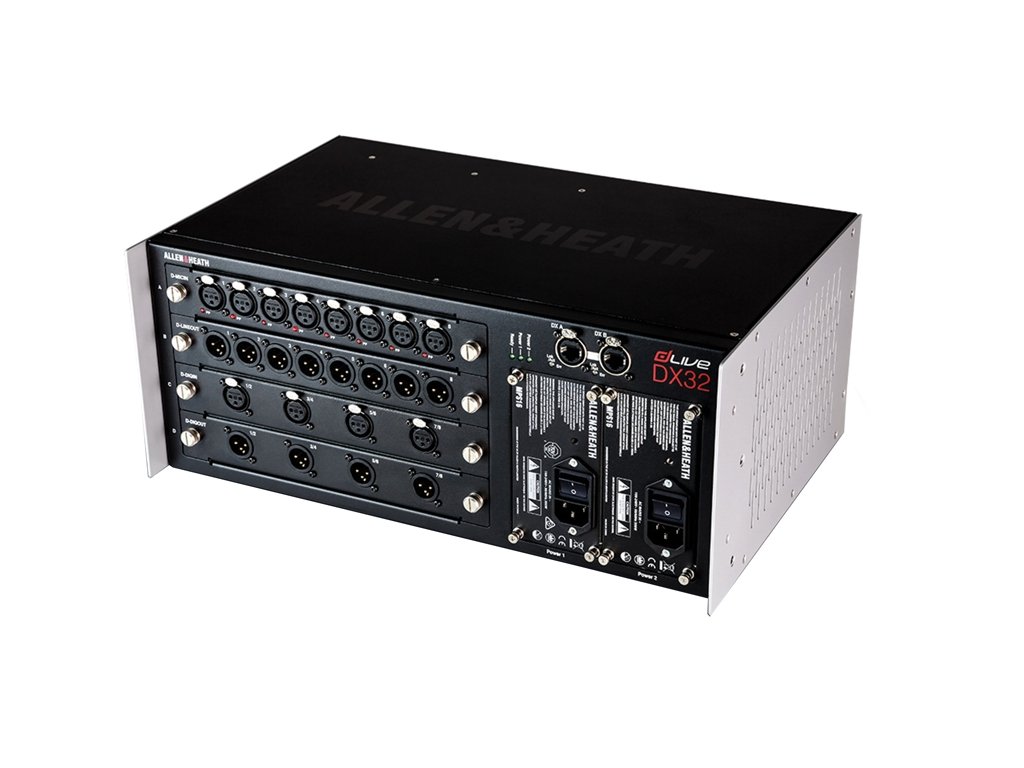 Modulární expander DX32 přidává vstupy, výstupy a dálkové ovládání do systému dLive. Disponuje 4x 8 kanálovými sloty pro analogové a digitální konektory. Celý systém je uzpůsoben pro připojení dvou expanderů k MixRacku a třetí lze zapojit přímo do Mixpultu.