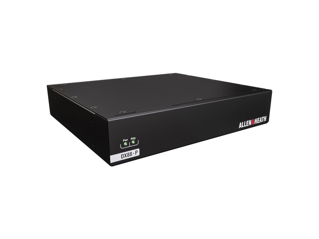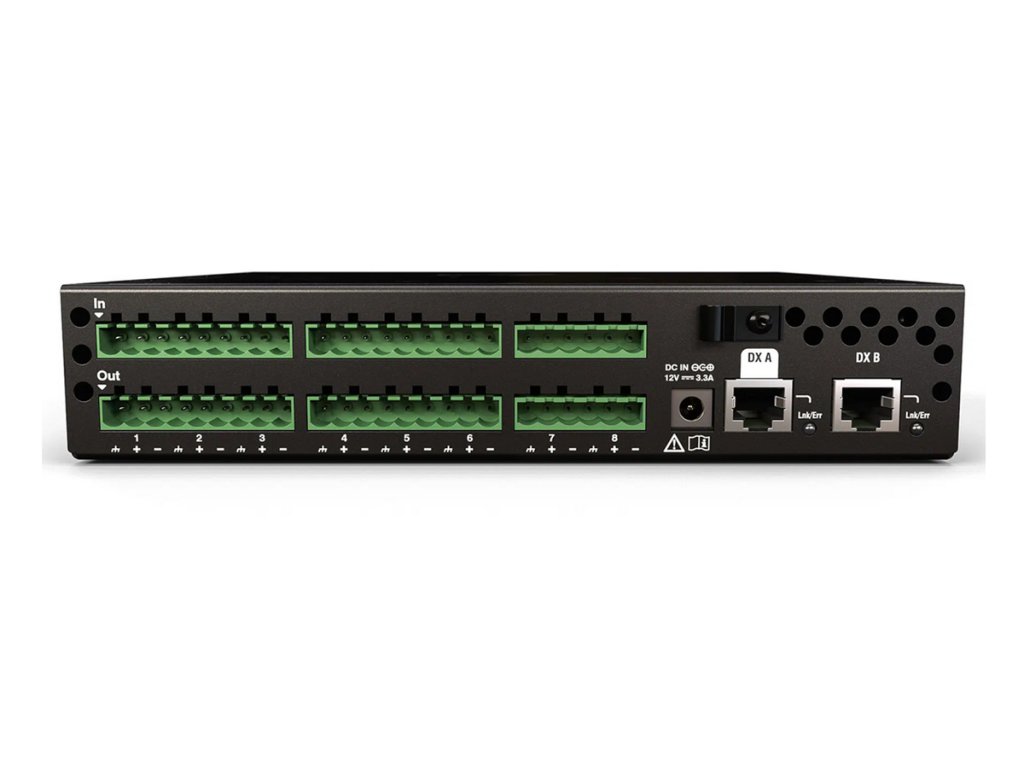 Instalační expandér DX88 přináší 8 vstupů a 8 výstupů ve Phoenix/Euroblock panelu, optimalizované pro pevné instalace. Zařízení usnadňuje lokální nebo vzdálené rozšíření maticových procesorů řady AHM.