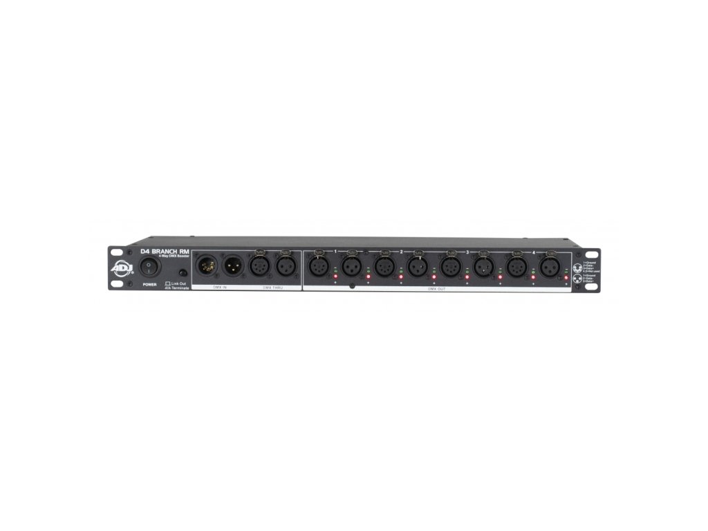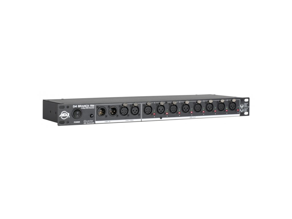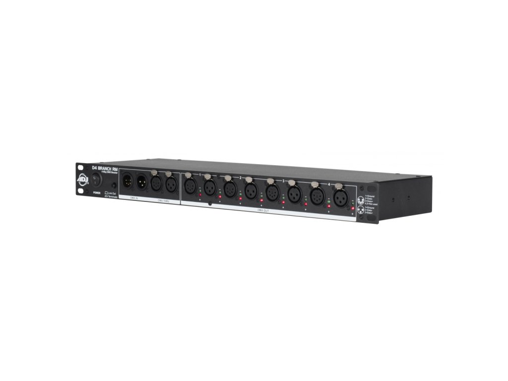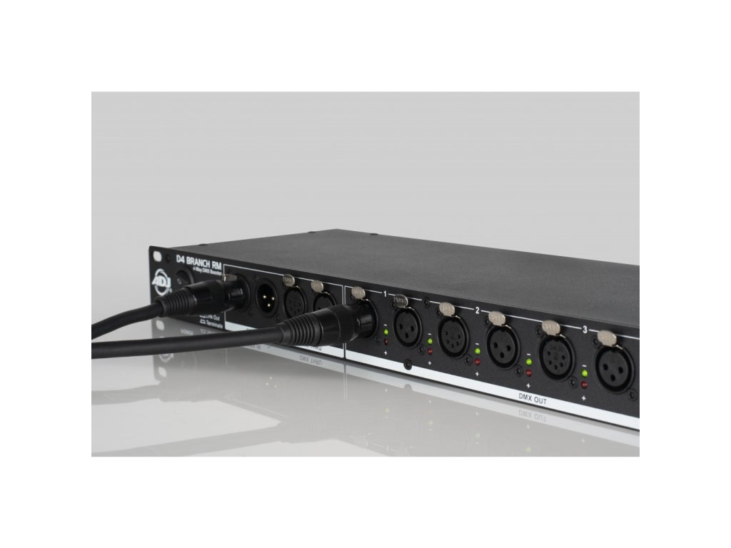 D4 Branch RM je 4-cestný DMX datový splitter/zesilovač o rozměru 1 RU, osazený na vstupu i výstupech konektory XLR 3-pin a 5-pin XLR. Jednotka přijímá DMX signál a rozděluje jej na čtyři samostatné elektronicky izolované výstupy se samostatným zesílením signálu. Jednotka obsahuje tlačítko aktivace/deaktivace propojení pro pohotové řešení problémů.
