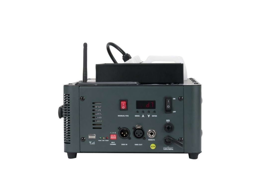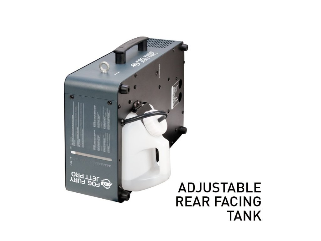 Fog Fury Jett PRO Jet je výkonný výrobník mlhy s integrovaným světelným zdrojem 28 x 3W RGBAUV LED (6 červených, 7 zelených, 6 modrých, 3 amber & 6 UV) produkující suché a rovnoměrné oblaky mlhy dlouhé až 12 metrů. Fog Fury Jett PRO obsahuje pokročilou technologii ohřevu a speciální konstrukce topného tělesa zabraňuje ucpání potrubí. Optimální výkon poskytuje vysoce výkonné italské čerpadlo, optimální teplotu zajišťuje technologie ADJ Electronic Thermo Sensing (ETS) krátkými intervaly ohřevu mezi výfuky mlhy. Fog Fury Jett PRO je možné použít vertikálně nebo horizontálně. Nádrž s kapalinou lze upevnit na přední nebo zadní stranu mlhy, takže mlha lze namířit nahoru nebo dolů. Zařízení lze ovládat prostřednictvím 3-pin a 5-pin DMX konektorů nebo WiFLY EXR bezdrátového zařízení DMX. Součástí balení je i bezdrátové dálkové ovládání ADJ FFJWR.