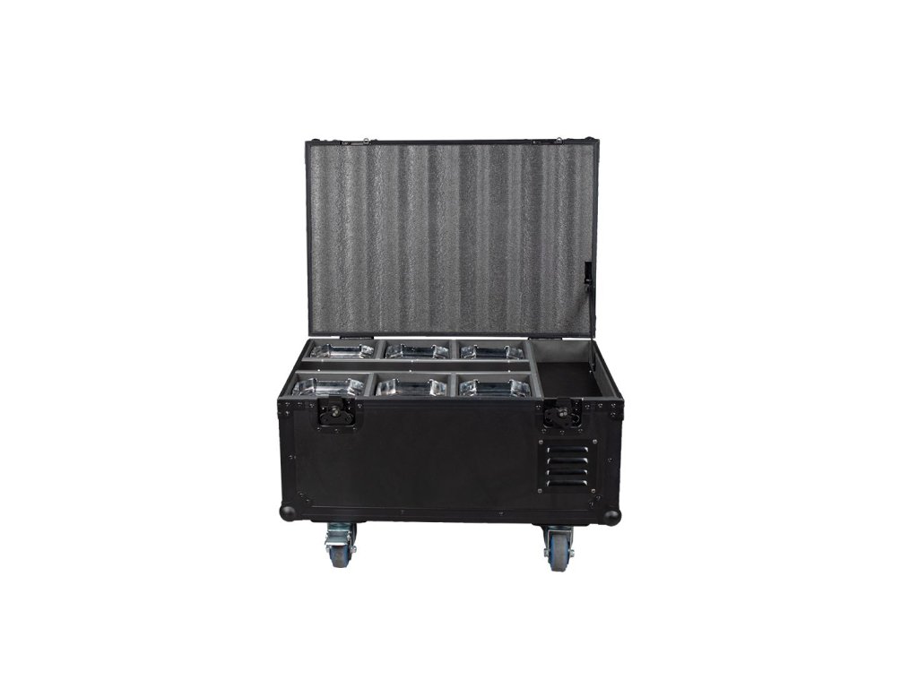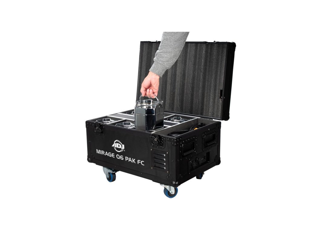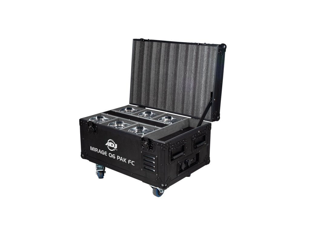 MIRAGE Q6 PAK je "all in one" set šesti svítidel s univerzálním využitím. Světla disponují krytím IP65, bateriovým napájením a odolným flightcase ve kterém všechna světla dobijete. Každé jedno svítidlo je napájeno čtyřmi 10W LED RGBA (red, green, blue, amber), které mají vyřazovací úhel 11 stupňů. MIRAGE Q6 má certifikaci IP65 takže je vhodné na krátkodobé venkovní použití. Vestavěný DMX WiFLY EXR umožňuje svítidlům komunikovat s řídící jednotkou na dálku a to až do vzdálenosti 700 m.