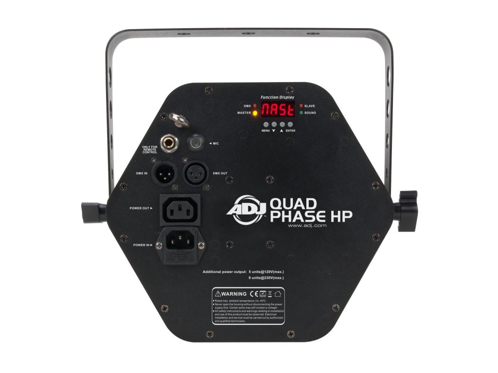 Quad Phase HP dokáže díky velkému množství ostrých světelných paprsků naplnit místnost a uchvátit davy. Tento technologicky vyspělý moonflower efekt má vysoce výkonný 32W čtyřbarevný LED zdroj 4v1 (RGBW). Quad Phase HP poskytuje dvakrát tolik velkolepých barev než "TRI LED", je schopen vytvořit celkem až patnáct barev. Nabízí také nejmodernější funkce, které jsou u speciálních světelných efektů vyhledávány, jako například: DMX-512 protokol pro programování a spojování, vzrušující vestavěné programy ovládané zvukem, žádné pracovní cykly (provoz po celou noc), LED zdroj s dlouhou životností (30 000 hodin) a vysokým výkonem, 4tlačítkový DMX displej na zadní straně (jednoduché programování), řetězení IEC napájecími kabely a 1,8 stupňový krokový motor pro hladký pohyb. Quad Phase HP lze ovládat DMX ovladačem nebo mini ovladačem UC3 společnosti ADJ.