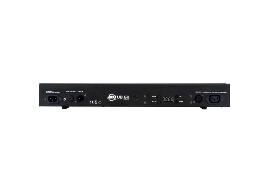 UB 6H je profesionální 6x6 Watové RGBWA+UV LED světlo. Každá z LED světla svítí 40° Beamem a přináší živé barvy pro parkety, stěny a stage. UB 6H má převratné šasi s patentovanoným magnetickým propojením ke světlu stejného typu, snižují se tak náklady na čas. Světlo umožňuje vytvářet makra (color presety). LED Světlo ADJ UB 6H lze nastavit přes 4 tlačítkové menu, protocol DMX-512 menu, a nebo také přes dálkový ovladač. Světlo pracuje v režimu Flicker Free operation @2200Hz, snižuje nebo eliminuje vnímání blikání obrazovky to ocení zejména kameramani a fotografové. Součástí balení je i příslušenství pro uchycení na zeď nebo na zem.