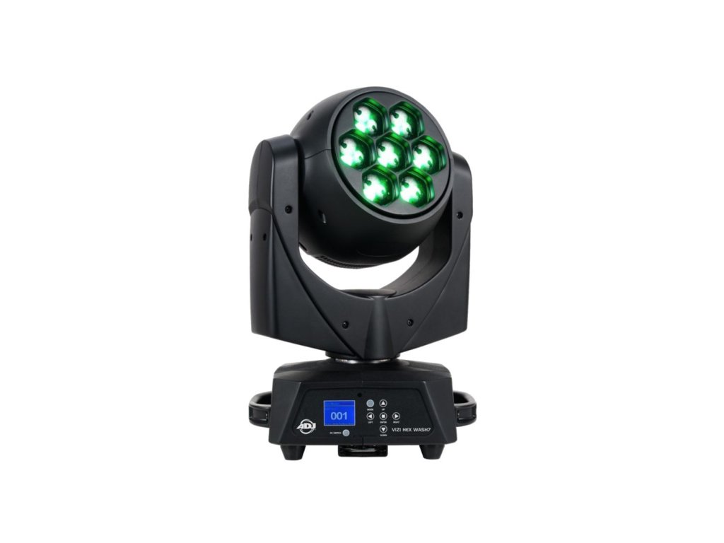 American DJ Vizi Hex Wash7 je profesionální otočná hlava s variabilním zoomem (7 ~ 58 stupňů) a 7x 15W LED HEX (RGBA+UV). Svítidlo je vybaveno 64 vestavěnými barevnými makry, velice rychlým pohybem otáčení hlavy, elektronickým stmíváním s možností 5 stmívacích křivek a režimem inverze otáčení. Vizi Hex má 3 režimy kanálů DMX, 3-pin i 5-pin připojení DMX a uzamykatelné napájení. Svítidlo je možné ovládat na dálku a bezdrátově pomocí DMX WiFLY od společnosti American DJ. Osvětlení je vhodné pro pódia, divadla, koncerty apod.