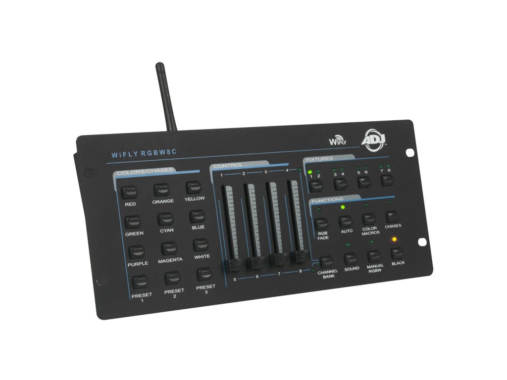 American Dj – WiFly RGBW8C 64-kanálový RGB, RGBW, RGBA, LED bezdrátový DMX ovladač standardních 3 nebo 4 kanálových LED reflektorů, kde kanál 1 je červená barva, kanál 2 je zelená barva a kanál 3 je modrá barva a kanál 4 je bílá nebo jantarová barva. Čtyřmi tlačítky lze nezávisle ovládat až 8 LED reflektorů nebo skupin reflektorů nastavených do režimu DMX-512