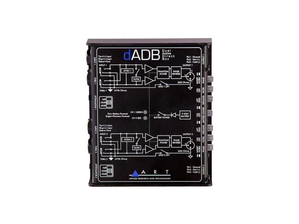 ART dADB (active Dual Direct Box)je duální aktivní direct box se dvěma nezávislými kanály vysoké kvality pro připojení nástroje nebo linkového signálu do symetrického výstupu. Vstupní konektory jsou 1/4" symetrické nebo nesymetrické jacky, konektory průchozího signálu jsou řešeny taktéž pomocí konektoru 1/4" jack. Výstupní signál je veden do dvou konektorů XLR. Frekvenční rozsah DI boxu je 10 Hz až 100 kHz. Vstupní úroveň je přepínatelná (0dB, -30dB), zapínat lze také otáčení fáze a Low Pass Filter.