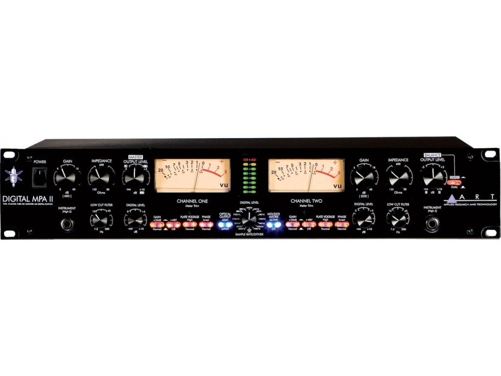 ART Digital MPA II • profesionální dvoukanálový mikrofonní předzesilovač s digitálními výstupy • elektronky 12AX7 • 24-bit / 192 kHz • podsvětlené VU metry • až 70dB gainu • diskrétní předzesilovače třídy A • elektronky 12AX7 • rackový formát 2U • napájení: 230V • hmotnost: 4,7 kg
