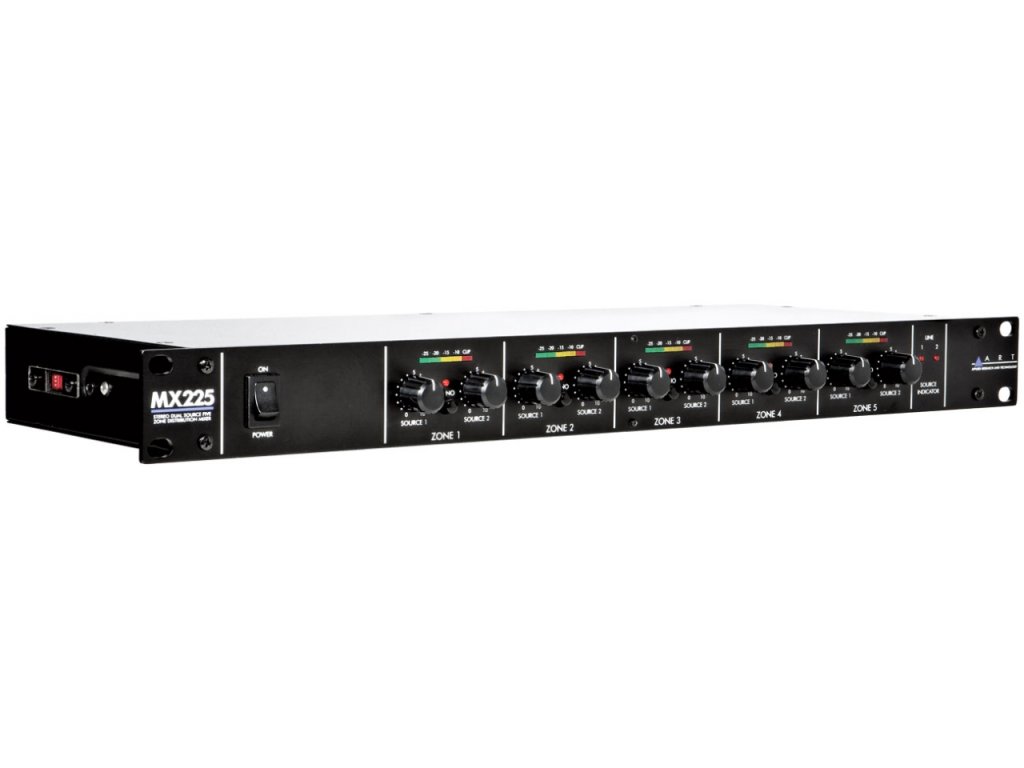 ART MX225 • stereofonní maticový distribuční mix • dva stereo vstupy • regulace hlasitosti vstupů pro každou zónu • LED indikace úrovně • symetrické vstupy a výstupy XLR • 1U rack • kovová konstrukce • rozměry 44.5mm x 483mm x 184 (mm) • hmotnost 2,24 kg