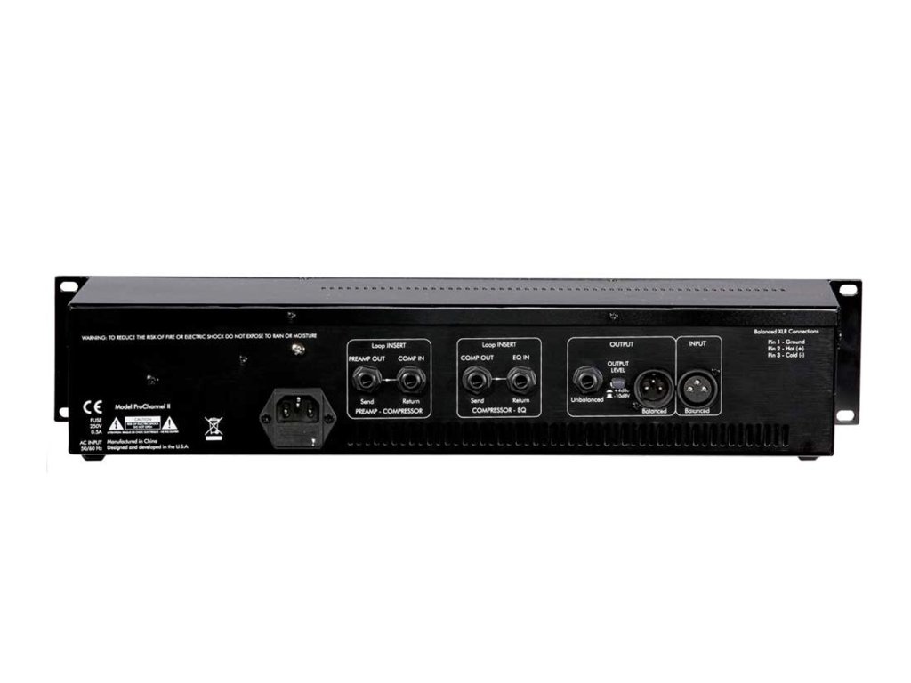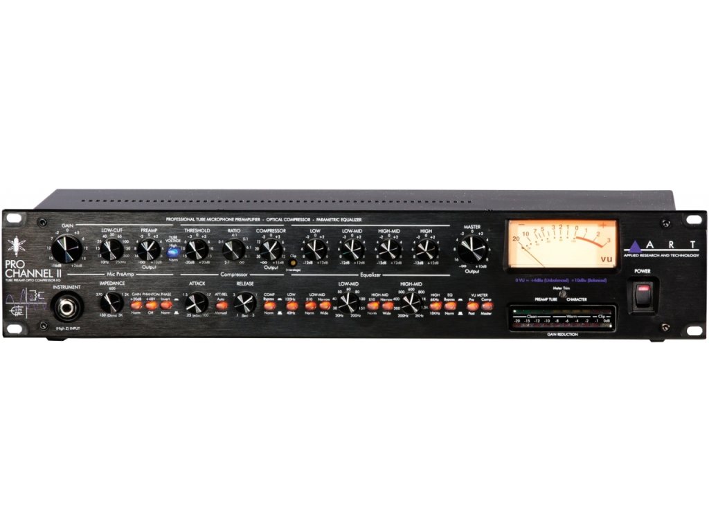 ART PRO Channel II • profesionální lampový mikrofonní a nástrojový předzesilovač • lampový optokompresor • 4-pásmový parametrický ekvalizér • 4 / -10 dB přepínač pro optimální úroveň výstupního signálu • frekvenční odezva 12Hz až 100 kHz (+0,-1dB) • kompresor/limiter • nastavitelný Gain • velké VU metry • přehledné ovládání • 2U rack • vstupy a výstupy XLR a Jack 6.3 • rozměry 890 x 483 x 233 (mm) • hmotnost 5 kg
