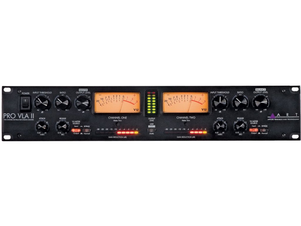 ART PRO VLA II • profesionální dvoukanálový opto-kompresor s plynule proměnnými časovými konstantami • dynamický rozsah >100 dB • frekvenční rozsah 10Hz až 20kHz (+/- 0,5 dB) • THD <0.1% • napájení: 230V • 2U rack • přepínatelné doby náběhu (2 nebo 15ms) a doběhu (300ms nebo 100-3000ms) • plynule nastavitelný kompresní poměr • ručně vybíraná elektronka 12AX7 • rozměry 89 x 483 x 233 (mm) • hmotnost 4 kg