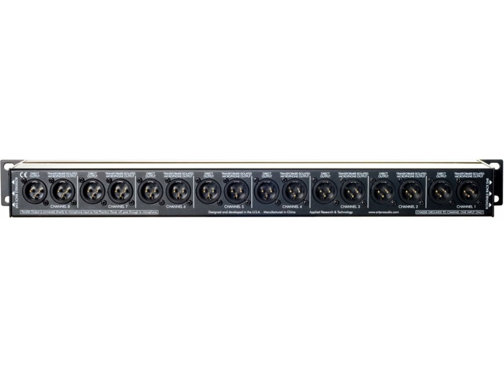 Art - S8 • osmikanálový pasivní mikrofonní splitter • 16 symetrických výstupů • galvanicky odděleno • vstup a výstup XLR • Ground lift a PAD 29dB pro každý kanál • 1U rack • hmotnost 1,7 kg