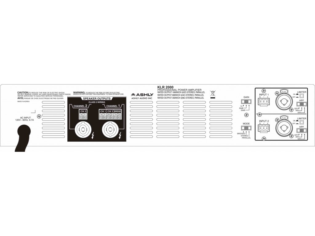 ASHLY KLR-2000 • zesilovač • 2x 350W / 8ohm, 2x 600W / 4ohm, 2x 1000W / 2ohm, 2000W / 4ohm bridge • třída AB • symetrické vstupy s konektory Combo XLR/ 1/4" TRS a 3-pin Euroblock • výstupní konektory Neutrik Speakon • rozměry 482x88x407 (mm), 2U • hmotnost 10,7 kg