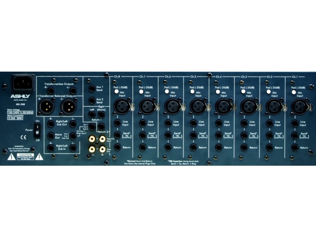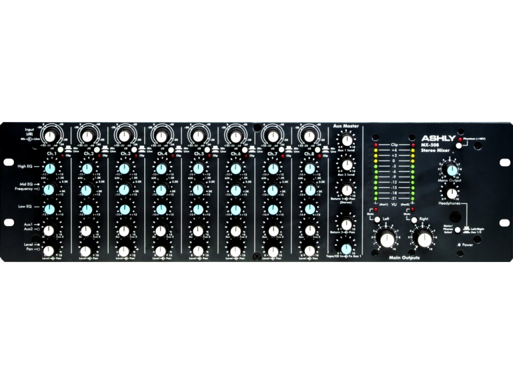 Ashly MX-508 • 8 symetrických vstupů XLR/Jack (mikrofonní předzesilovače s nízkým šumem a zkreslením, 3-pásmové EQ s laditelnou střední frekvencí, phantomové napájení 48 V, Aux Send/Return) • Vstup TAPE (2 x konektor Cinch) •Vstup SUB (2 x konektor Jack 1/4") • Master Aux Return (2 x konektor Jack 1/4") • Výstup Main (2 x XLR, 2 x 1/4", 1 x 1/4" (Mono)) • Výstup TAPE (2 x konektor Cinch) • Výstup SUB (2 x konektor Jack 1/4") • Sluchátkový výstup (konektor Jack 1/4") • Master Aux Send (2 x konektor Jack 1/4") • Montovatelný do racku • Rozměry: 133 x 203 x 483 mm • Hmotnost: 6,8 kg
