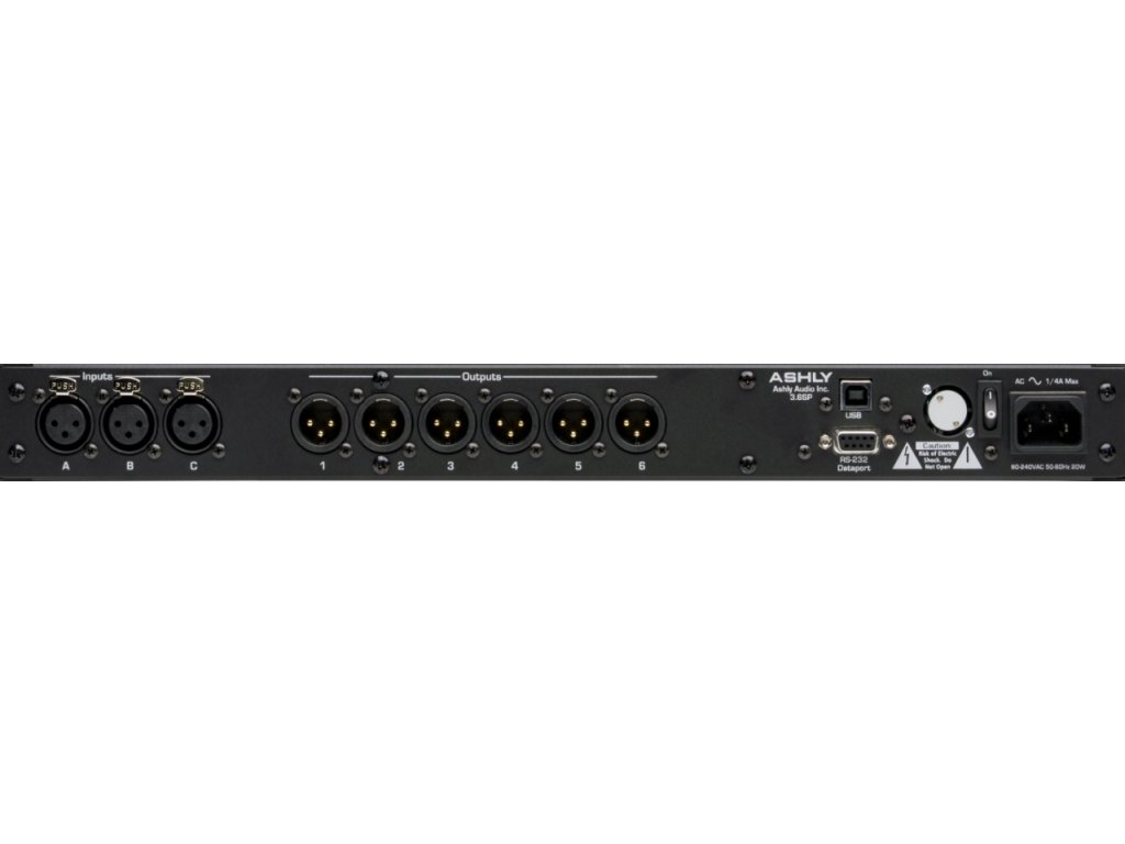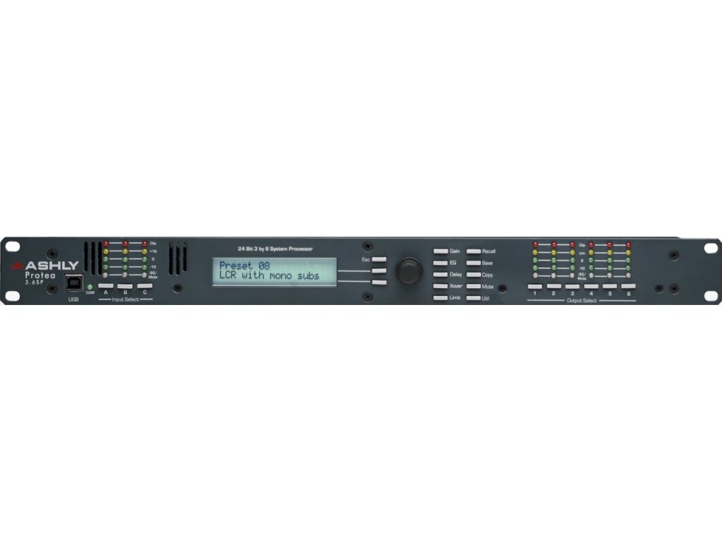 ASHLY Protea 3.6SP • signálový DSP procesor pro reproduktory • 3x XLR vstup 6x XLR výstup • x-over, PEQ, Hi/Low filtry, delay, kompresor, limiter, fáze • 24bit/48kHz • 2x USB, RS-232 • rozměry 483x216x89 (mm), 1U • hmotnost 4,1 kg