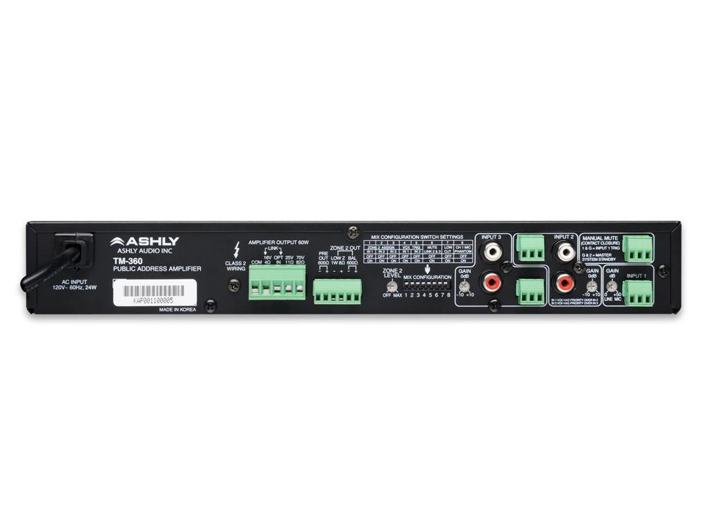 Ashly TM-360 • mixážní zesilovač • 1 symetrický vstup MIC/LINE s možností phantomového napájení, 2 symetrické linkové s možností přepnout na směšovací stereo vstupy • funkce Priority Mute • kmitočtové korekce Bass a Treble • Volitelný HPF 400 Hz • 60 W galvanicky oddělený mono výstup (4 ohm / 8 ohm / 70 V / 100 V) • Výstup Zone 2 (1W-8ohm/LINE) • příslušenství pro montáž do racku • rozměry 290 x 76 x 185 mm (Š x V x H) • hmotnost: 3,9 kg
