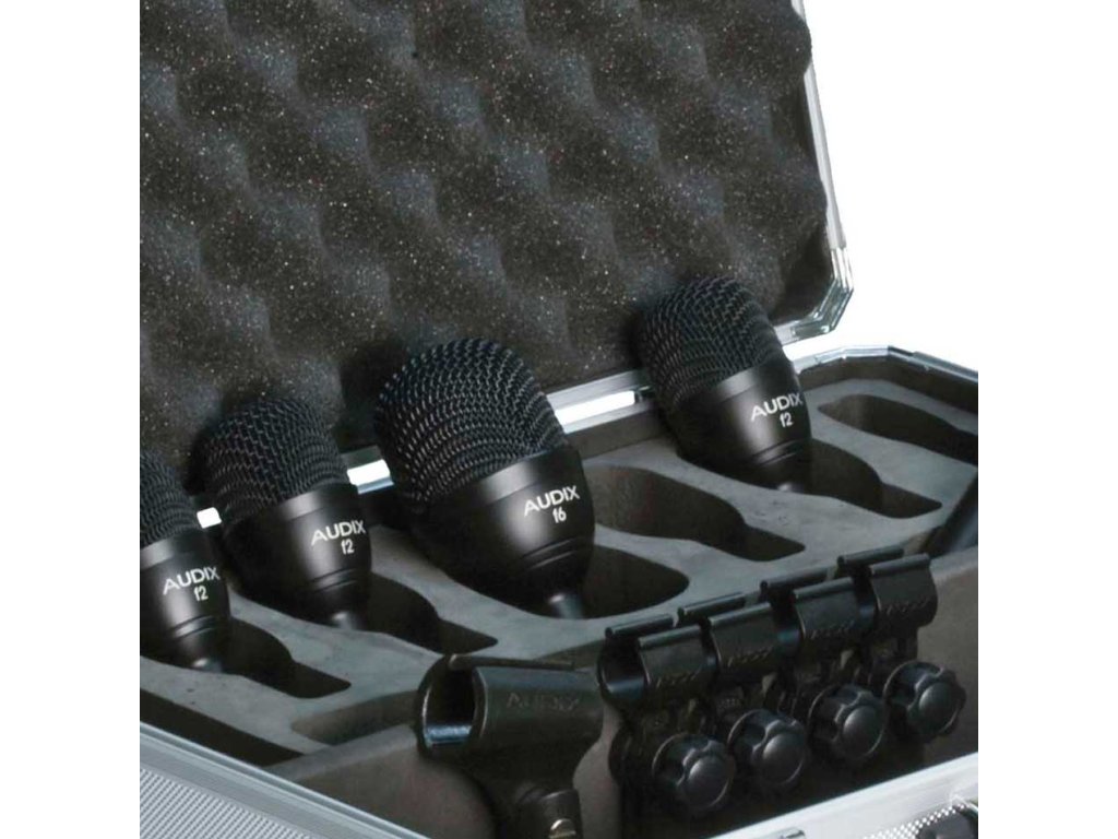 Audix - F5 • sada nástrojových dynamických mikrofonů pro bicí • 1× Audix F5 • 3× Audix F2 • 1× Audix F6 • 4× DClip • 1 × MC1 Clip • dodáváno včetně aluminiového kufříku
