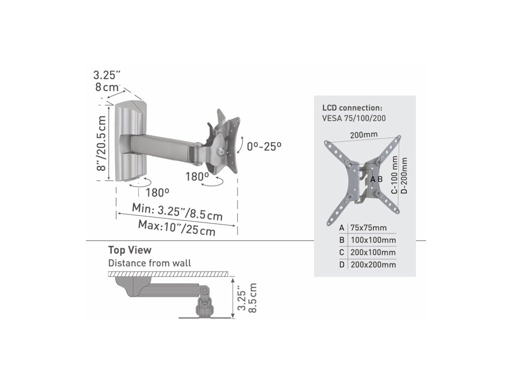 nástěnný držák pro LED/LCD/plasma, max. zatížení 25 kg, vzdálenost od stěny 9-26cm, hmotnost 1,9 kg, vhodné pro montážní otvory až do 400 x 400 mm (VESA & Non VESA), kompatibilní s Ultra Slim obrazovkami až do 56 palců / 142 cmDodatočné parametre