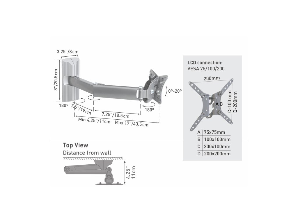 nástěnný držák pro LED/LCD/plasma, max. zatížení 25 kg, vzdálenost od stěny 11,7 - 44 cm, hmotnost 2,65 kg, vhodné pro montážní otvory až do 400 x 400 mm (VESA & Non VESA), kompatibilní s Ultra Slim obrazovkami až do 56 palců / 142 cmDodatočné parametre