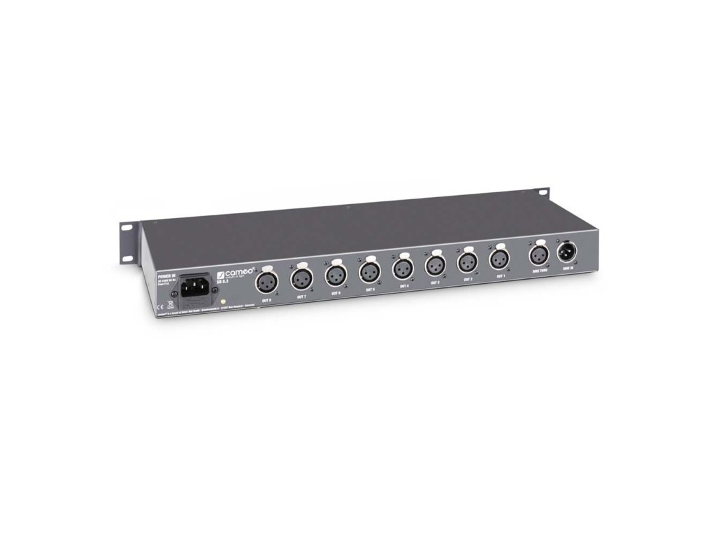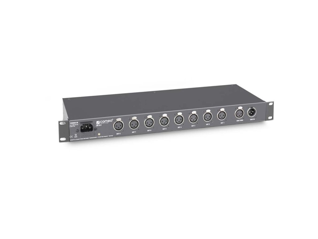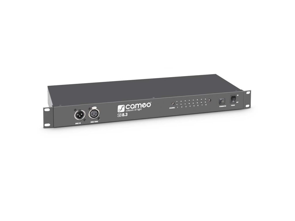 Cameo SB8.3 je profesionální splitter/zesilovač DMX signálu do 19" racku ve formátu 1U. Paralelně zapojené konektory pro DMX In a DMX Thru naleznete na předním i zadním panelu zařízení. Cameo SB8.3 má 8 izolovaných DMX výstupů. Všechny konektory jsou 3 pinové. Na předním panelu je DMX status LED indikace pro každý DMX kanál. Rackové uši lze přehodit jak na přední, tak na zadní stranu zařízení.