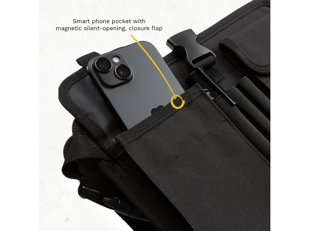 • Magnetické klopy kapes umožńují prakticky bezhlučné otevírání, což je ideální pro studiové a produkční prostředí.