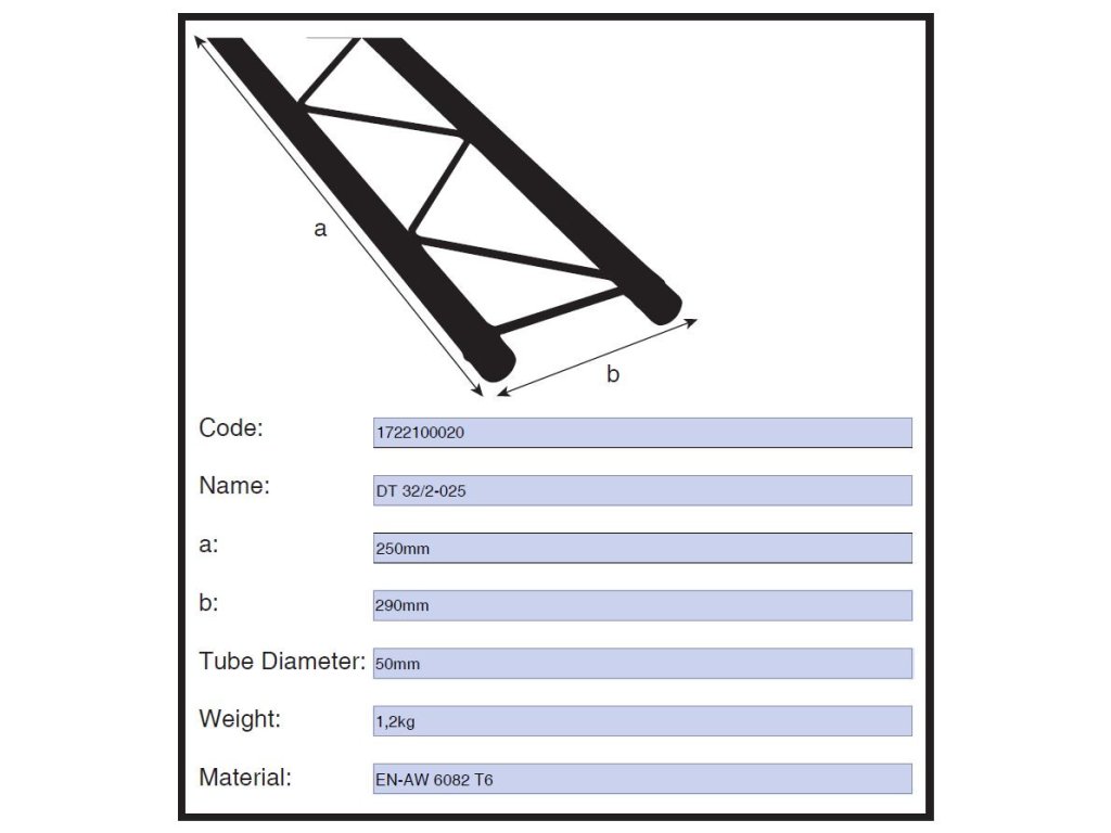 Duratruss DT 32/2-025 je duální příhradová konstrukce vybavená kónickou spojkou a bezpečnostní sponou.