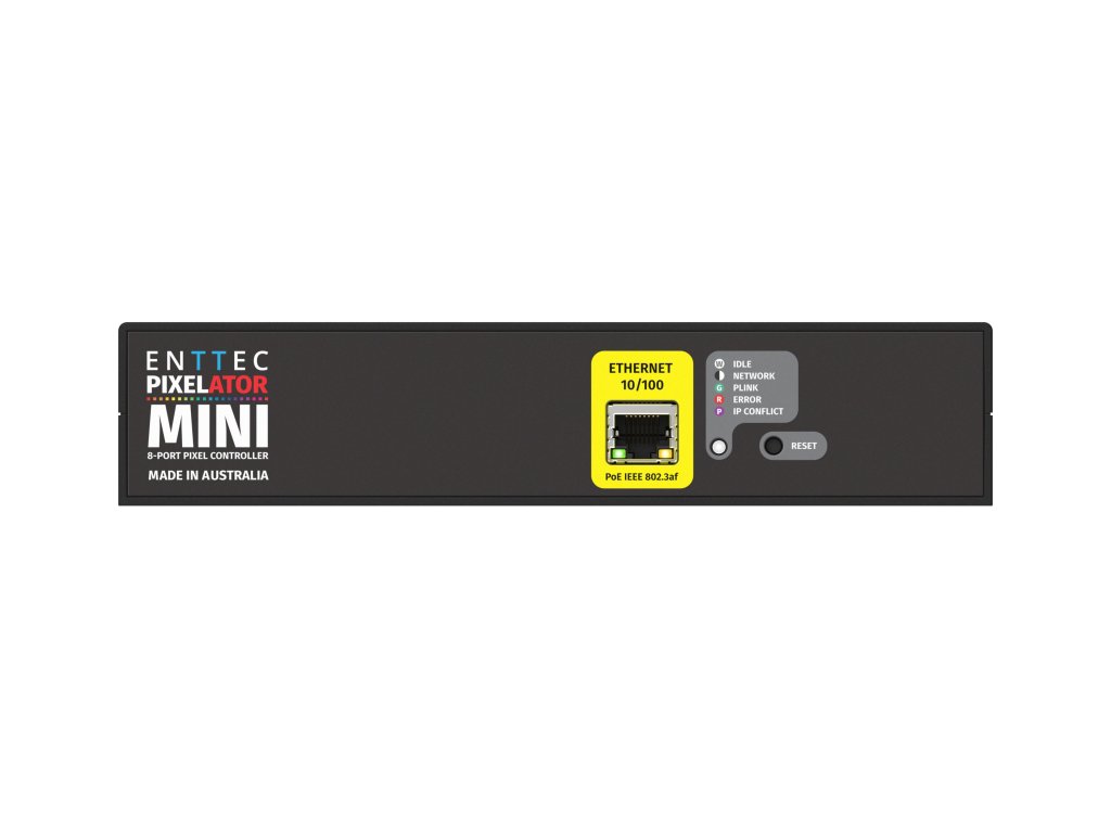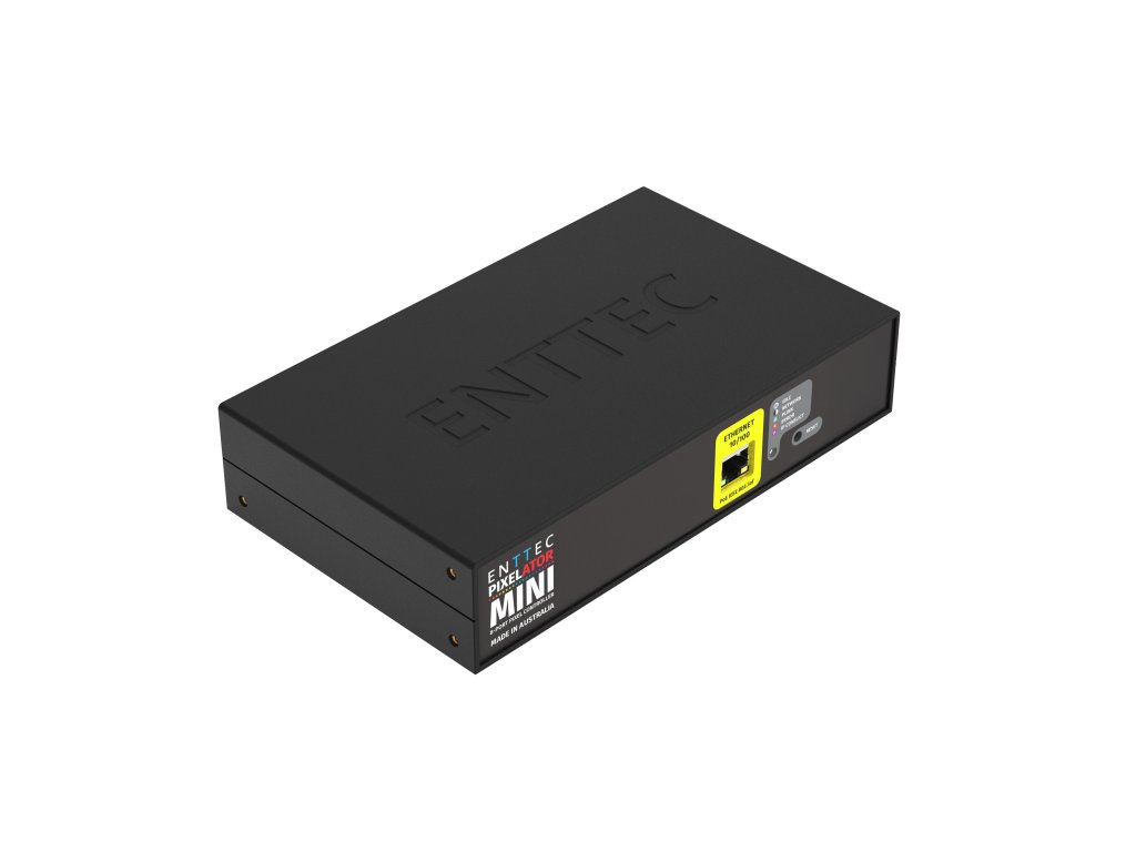 ENTTEC Pixelator Mini je ethernetový ovladač navržený pro snadné řízení LED světel, pixelových polí a digitálních LED pásků. Převádí řídící DMX data (16 DMX universe) přijímaná přes ethernet na data pro přímé řízení pixelů, která jsou posílána na 8 výstupních portů (RJ45; 2 DMX universe na port). Zvládne převádět až 8192 DMX kanálů (2730 RGB pixelů), díky interní vyrovnávací paměti s dokonalou vzájemnou synchronizací.