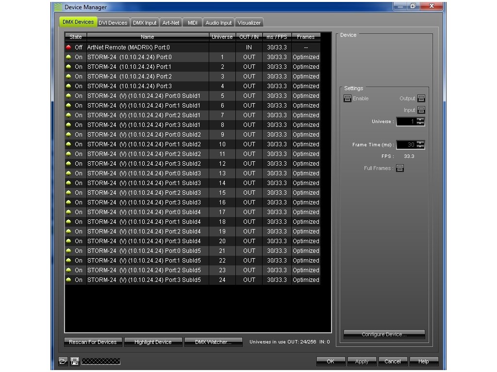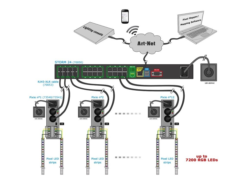 Storm 24 je jedním z nejvýkonnějších profesionálních převodníků Ethernet -> DMX 512, který zvládá spolehlivě převádět velké množství DMX dat ze sítě Ethernet. Je ideální pro všechna světla se samostatně mapovanými pixely nebo rozsáhlé světelné parky. Nabízí 24 DMX universe a v racku zabírá 1U.