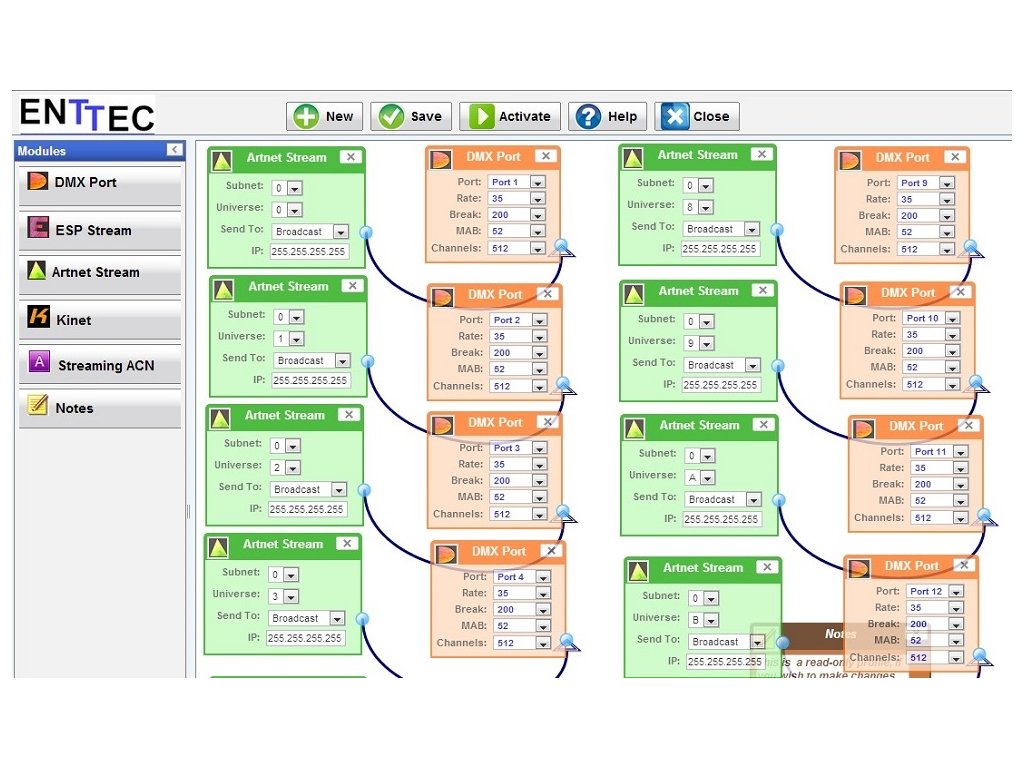 • podpora více protokolů: ArtNet 1, ArtNet 2, ArtNet 3, sACN, ESP