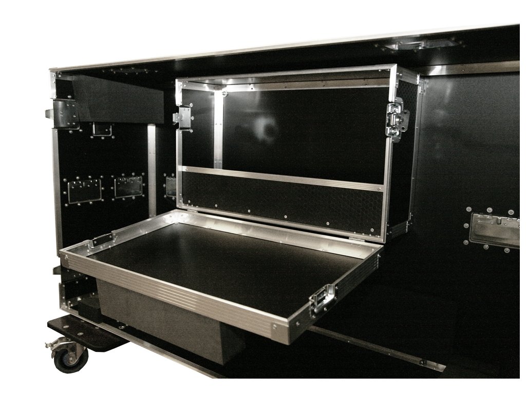 Speciální přepravní case navržený pro nejnáročnější touringové aplikace. Jako kování jsme zvolil prémiového výrobce Penn, splnující požadavky na dlouhodobý a spolehlivý provoz. Vnitřek case je vybaven uzavíracím boxem, do kterého lze bezpečně uložit příslušenství a kabely, které je potřeba mít v dosahu ruky.