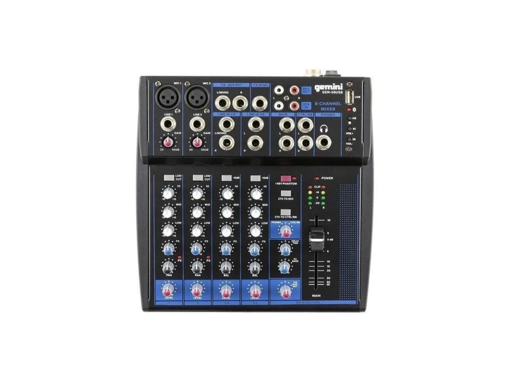 Nový mixážní pult Gemini GEM-08USB je vybaven 8 vstupy, 2 nejmodernějšími mikrofonními předzesilovači s fantomovým napájením, Bluetooth streamingem, USB přehráváním, interním Delay, 3-pásmovým ekvalizérem a dvěma samostatnými sběrnicemi.