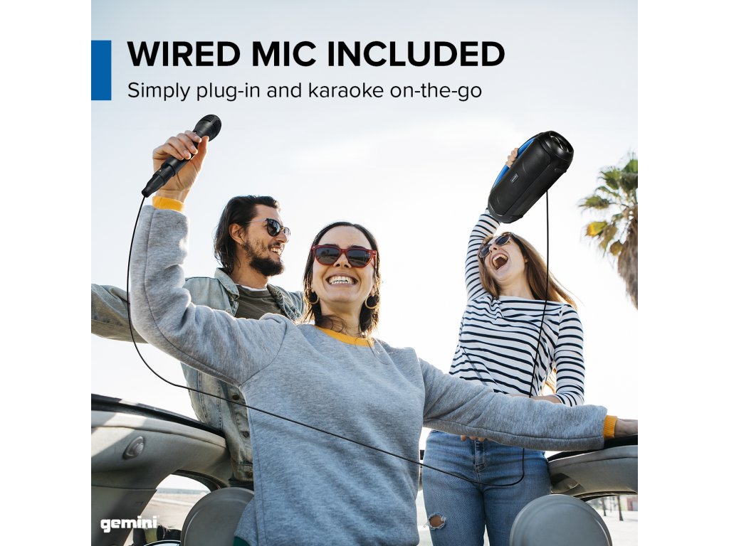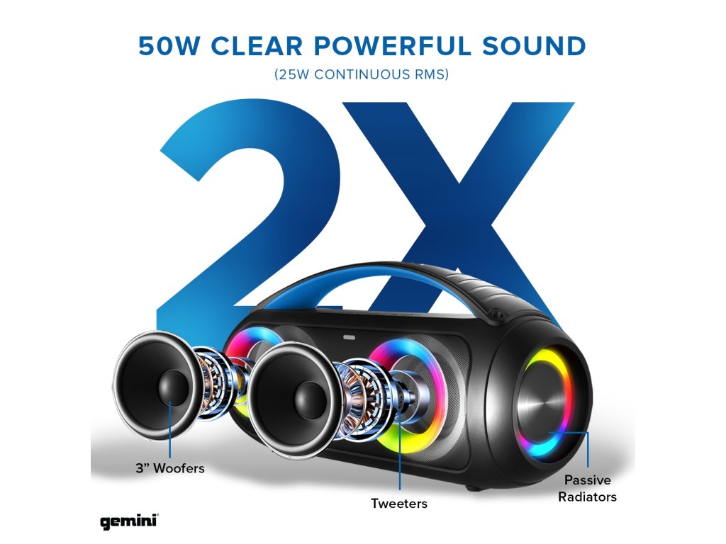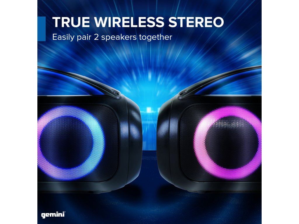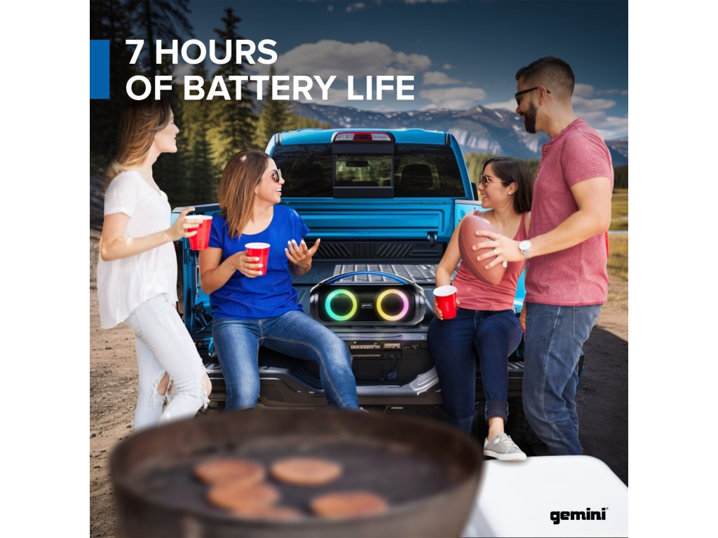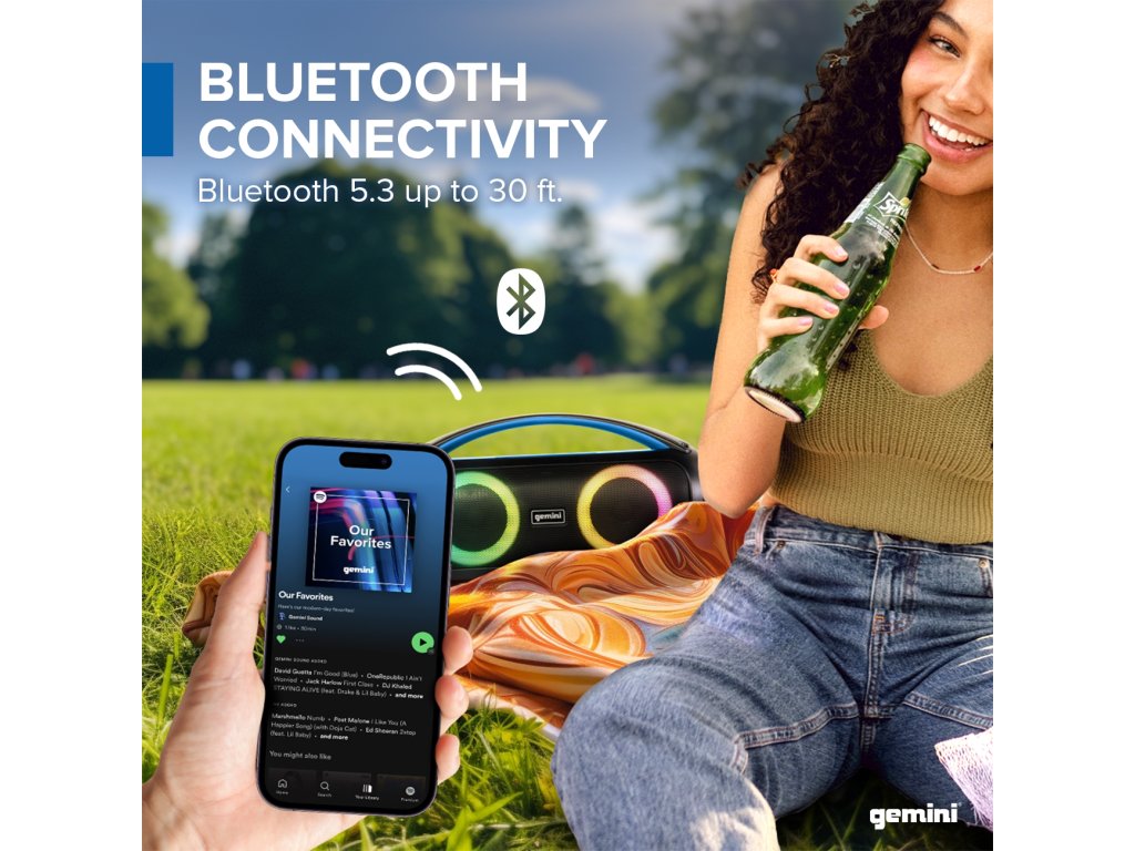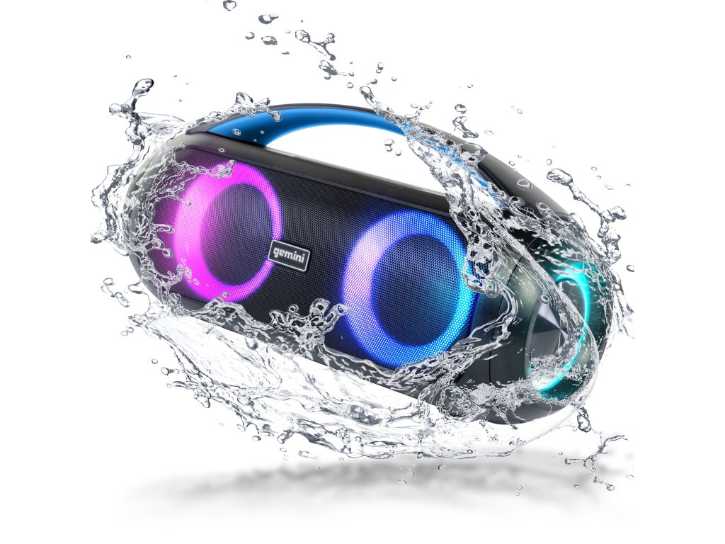 Gemini GGO-230L je voděodolný přenosný Bluetooth reprobox vybavený dobíjecí baterií pro bezdrátový provoz. Díky stupni krytí IPX5 odolává stříkající vodě u bazénu a venkovním podmínkám. Voděodolná konstrukce je ideální pro výlety na pláž, grilování na zahradě, kempování a domácí párty.