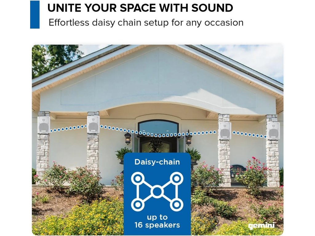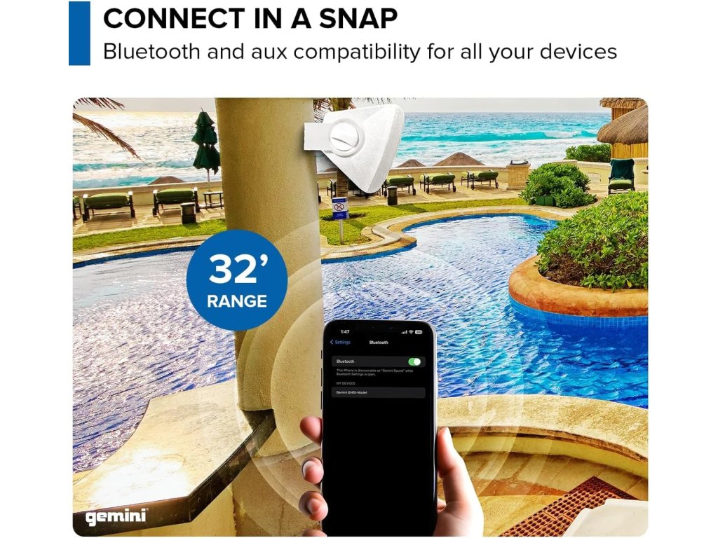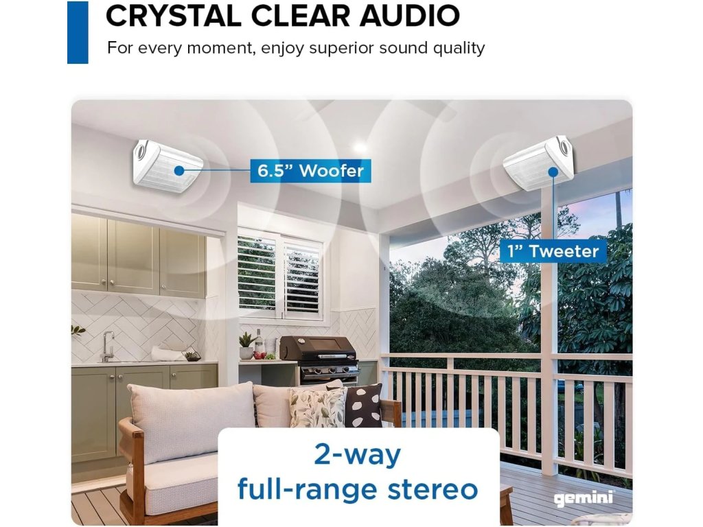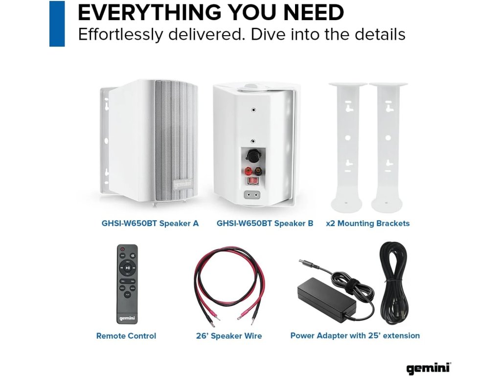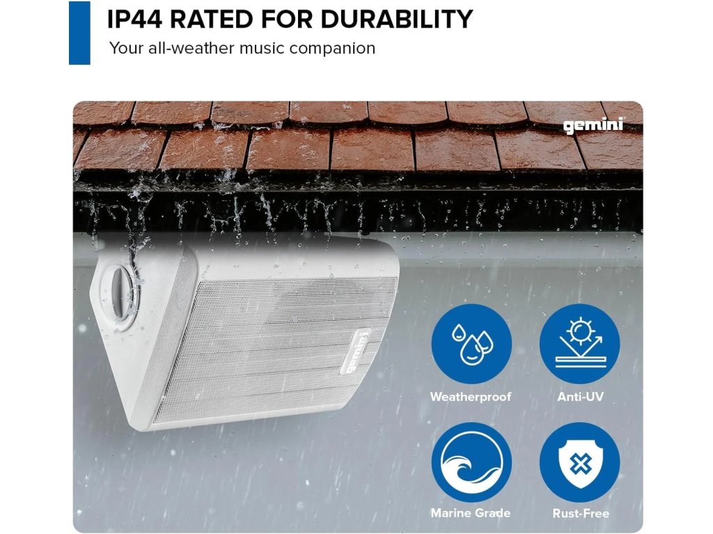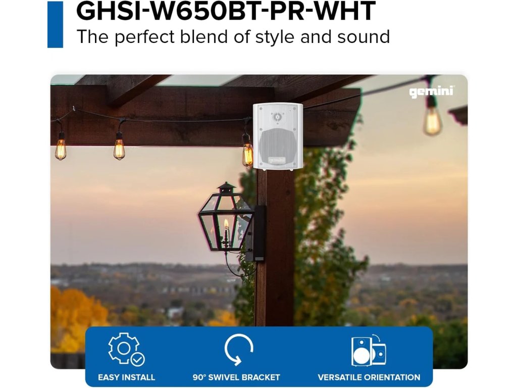 Venkovní Bluetooth pár reproboxů (aktivní+pasivní) Gemini GHSI-W650BT je ideální pro jakoukoli venkovní akci nebo zahradní párty, hodí se na terasu i k bazénu. Stupeň krytí IP44 a dlouhá životnost zajišťují perfektní výkon za všech povětrnostních podmínek. Zapojení více reproboxů umocní zážitek vytvořením prostorového zvuku. Díky připojení Bluetooth a dálkovému ovládání je ideální jako venkovní vodotěsný reprobox, který potřebujete ovládat na dálku.
