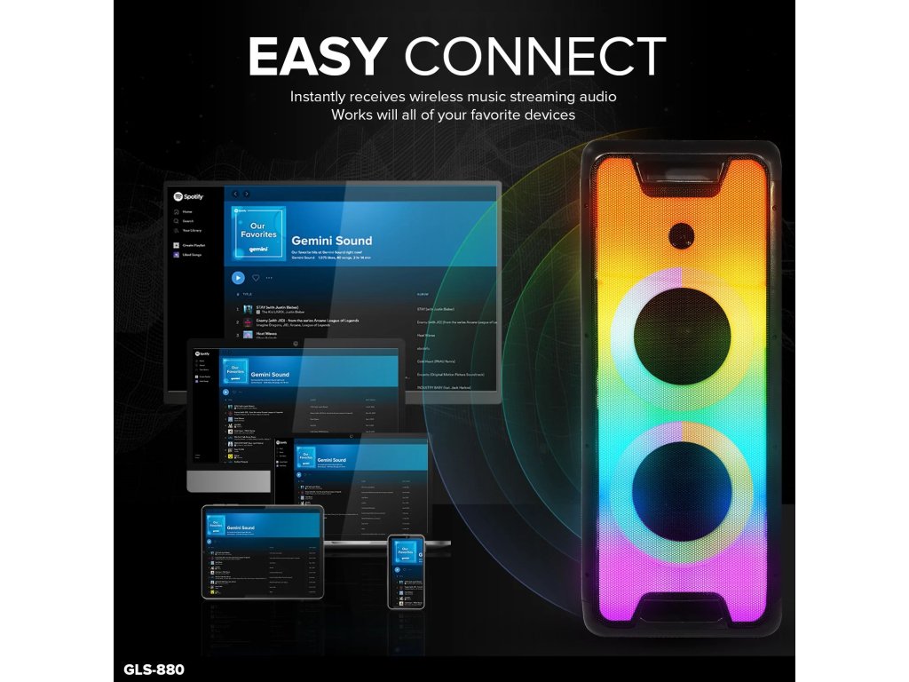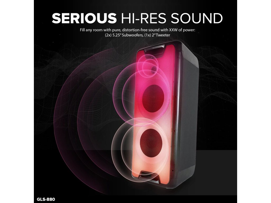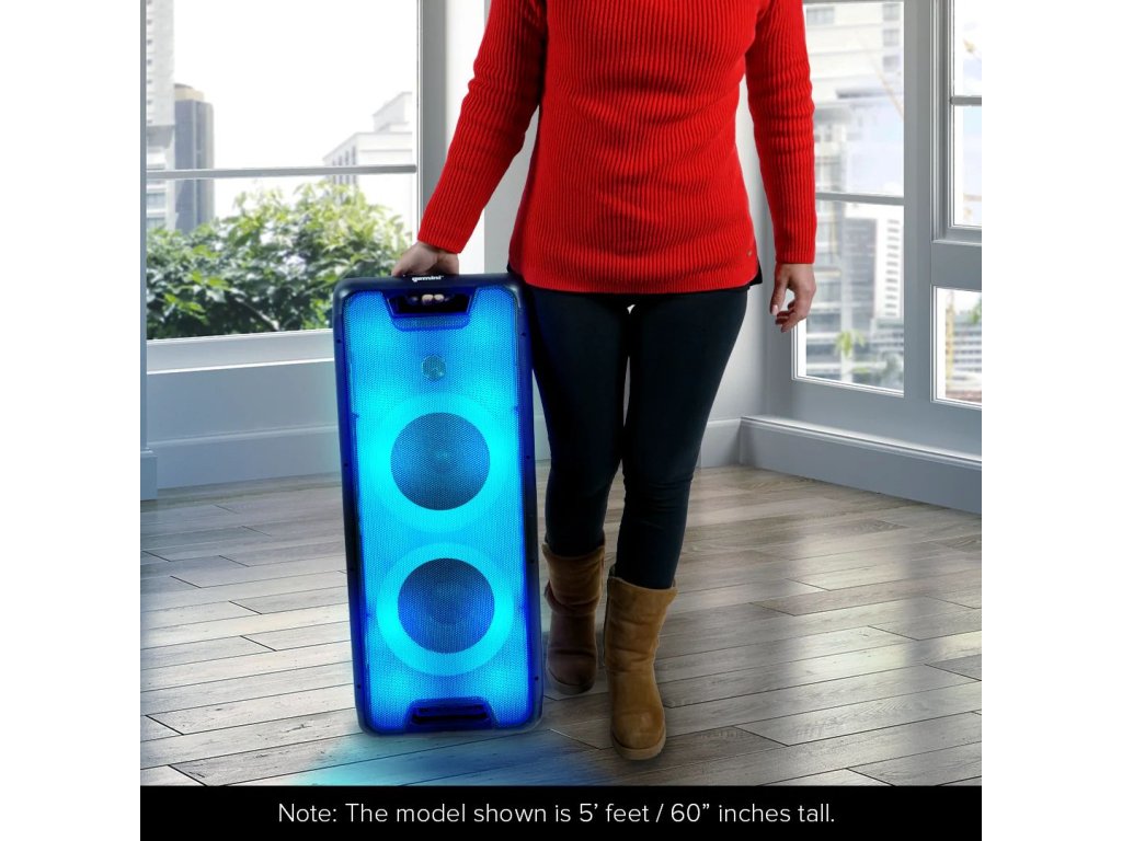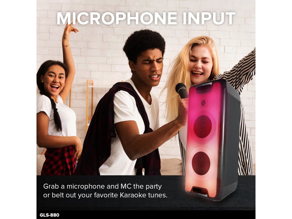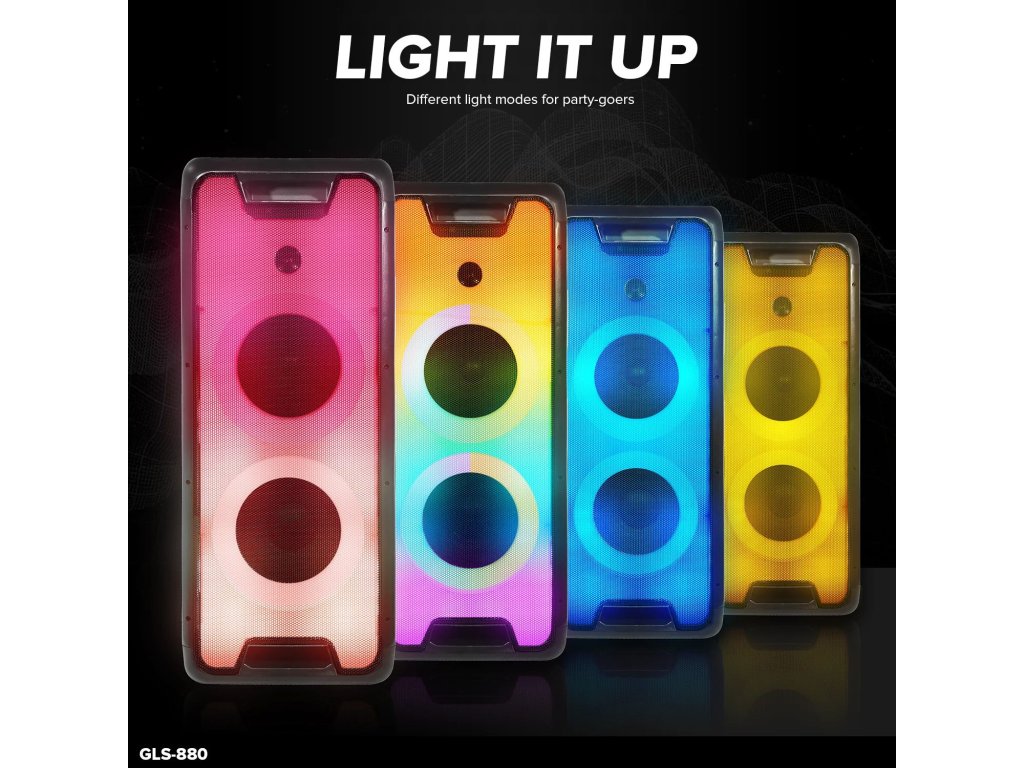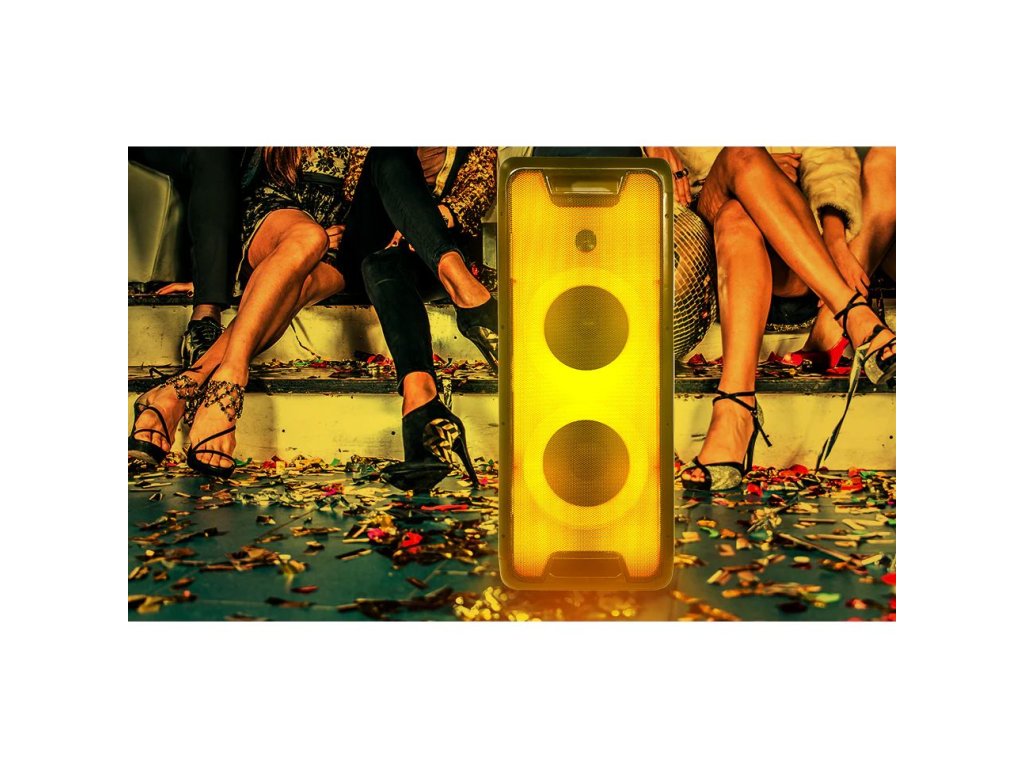 Přenosný výkonný párty reprobox s dvěma 8“ basovými reproduktory, 1“ tweeterem a barevnými světelnými efekty synchronizovanými s rytmem má zabudovaný zesilovač o výkonu 1000 W (Peak), dobíjecí baterii, samostatný ekvalizér pro mikrofonní a kytarový vstup, FM rádio a přehrávač hudebních souborů z USB nebo přes Bluetooth.