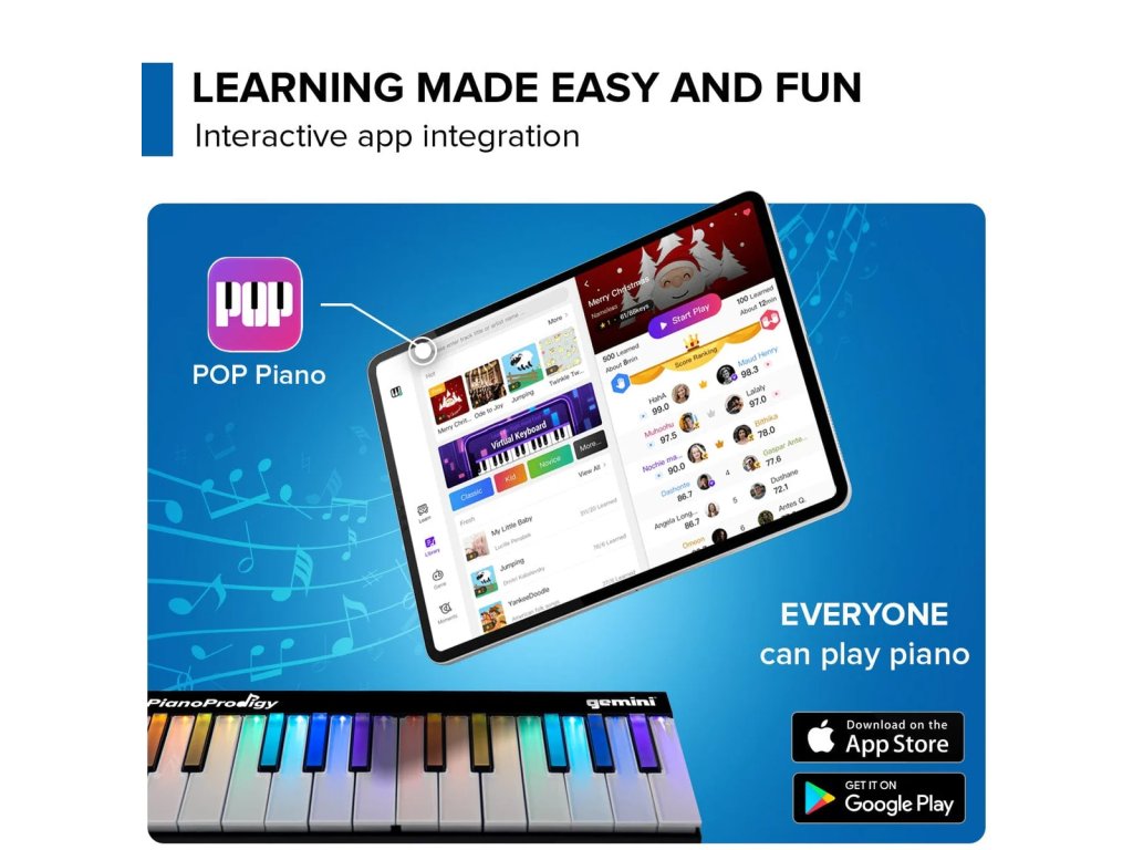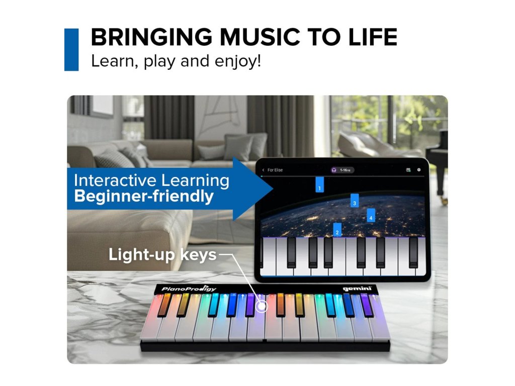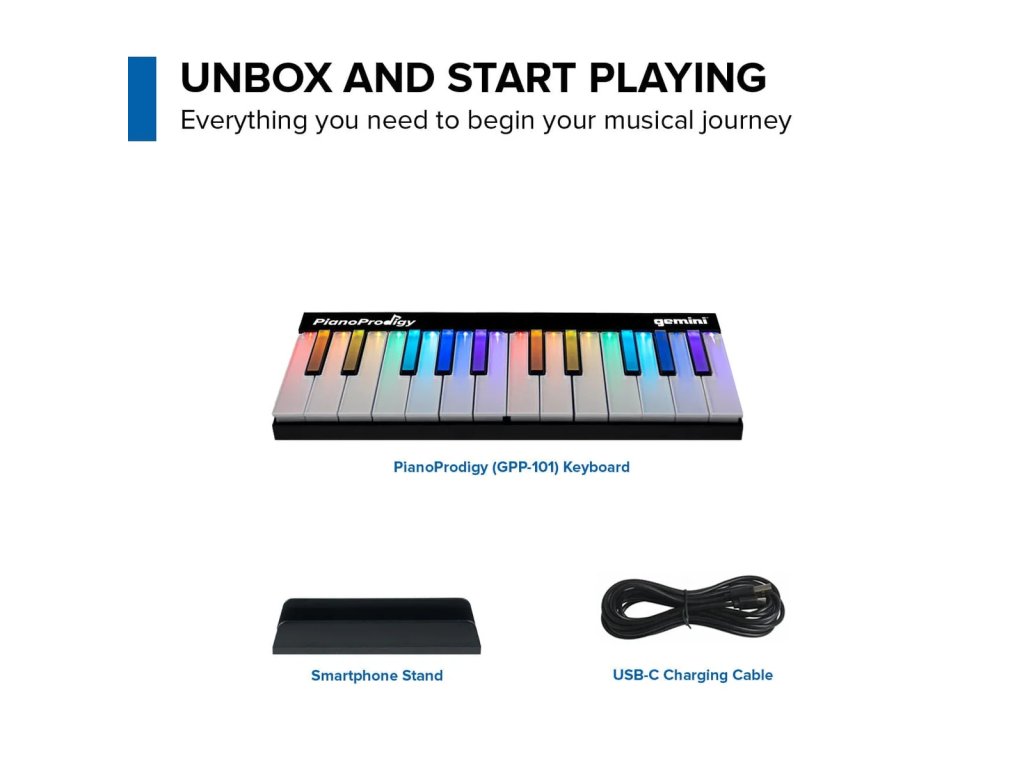 Gemini GPP-101 je 24-klávesová inteligentní bezdrátová MIDI klaviatura s podsvícenými klávesami určená pro zábavnou hru a výuku hry na klávesové nástroje. Dělá učení zábavné a intuitivní, a je ideální pro každou úroveň hráče.
