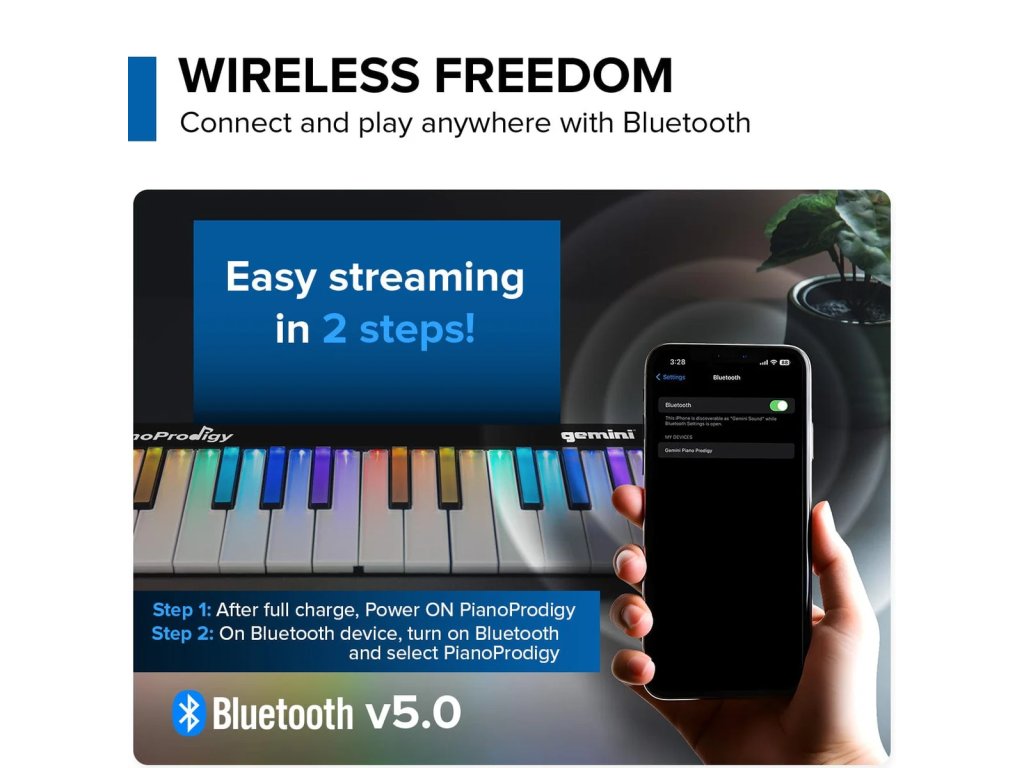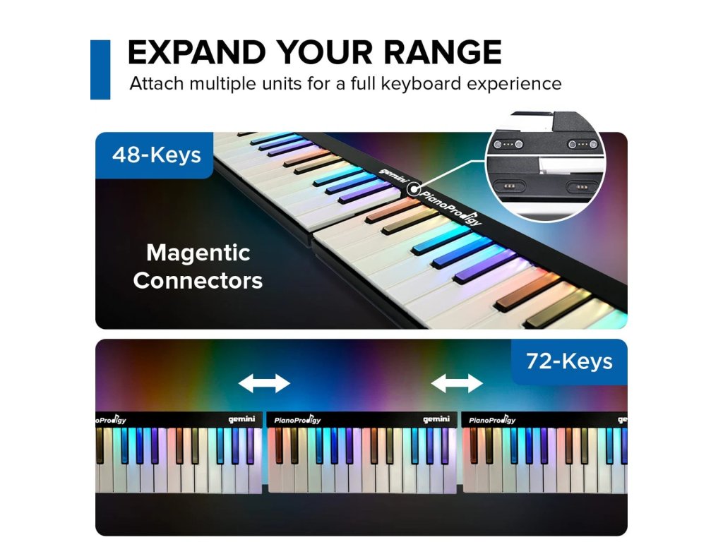 Gemini GPP-101 nemá vestavěné reproduktory, a aby produkovalo zvuk, musí být připojeno přes rozhraní USB-C k zařízení s operačním systémem iOS nebo Android nebo přes Bluetooth ke smartphone nebo tabletu. Spárujte zařízení se svým smartphone, tabletem nebo jakýmkoliv zařízením Bluetooth a začněte vytvářet melodie. Nahrávejte melodie nebo mixujte zvuky a proměňte své zařízení v dynamické hudební studio. 24-klávesové moduly lze napojovat a rozšířit tak rozsah klaviatury na 48 respektive 72 kláves.