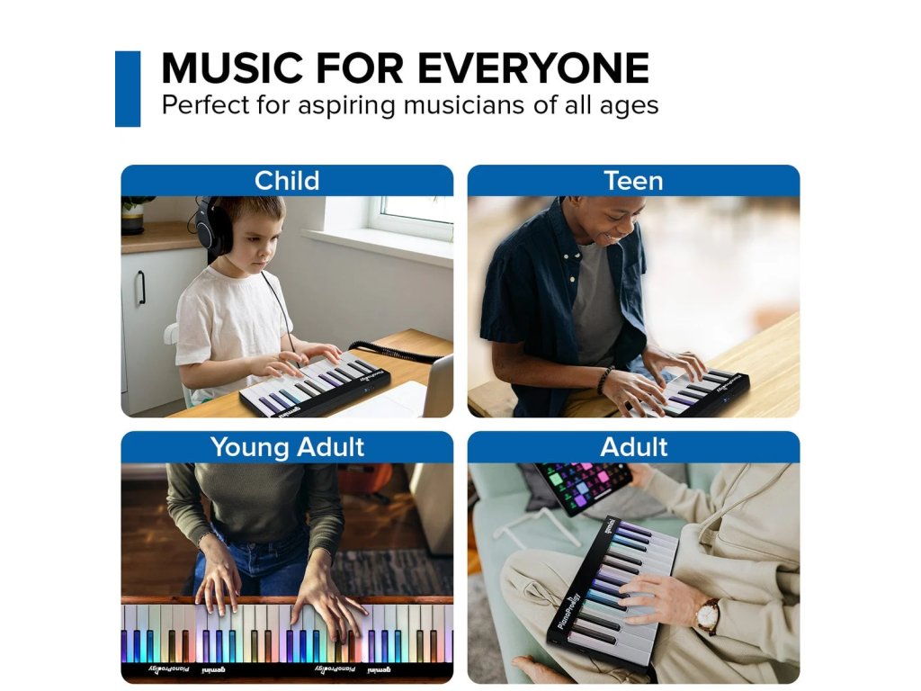 Připojení Bluetooth 5.0 umožňuje bezproblémové připojení k vašim oblíbeným hudebním aplikacím s podporou MIDI a vylepšuje tak váš zážitek z učení pomocí různých interaktivních lekcí a skladeb. Klávesy se rozsvítí řadou barev, navedou vaše prsty ke správným tónům a cvičení jsou poutavá a efektivní. Toto chytré piano je navrženo tak, aby se přizpůsobilo vašemu tempu učení a zajistilo, že každá lekce bude přínosná a zábavná.
