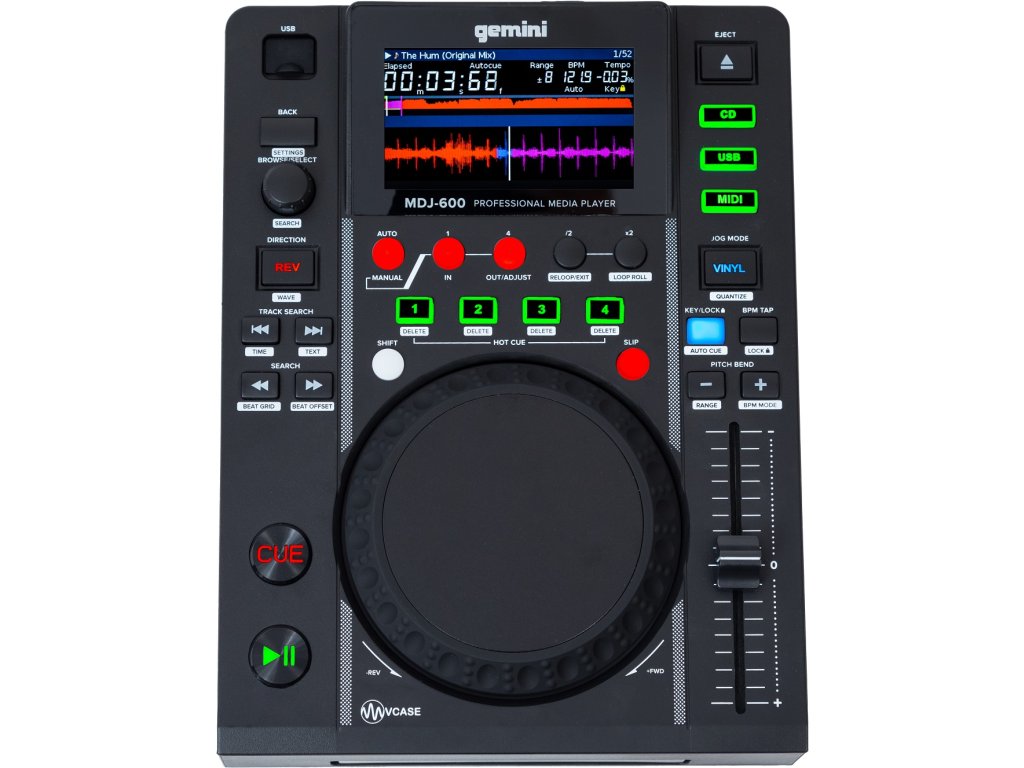Instalace software Gemini V-Case Library Management umožní rychlou a jednoduchou správu hudebních knihoven. MDJ-600 lze využít jako 24-bitovou/192 kHz zvukovou kartu pro přehrávání zvuku z počítače, zatímco v režimu MIDI poslouží jako kontrolér pro řízení parametrů a ovládacích prvků DJ software.