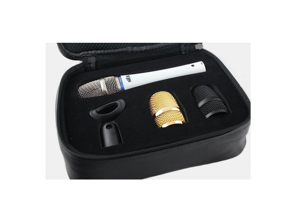 - Sada obsahuje držák, molitanový protivětrný kryt a tři výměnné síťky - zlatou, stříbrnou a černou. Síťky jsou akusticky identické.