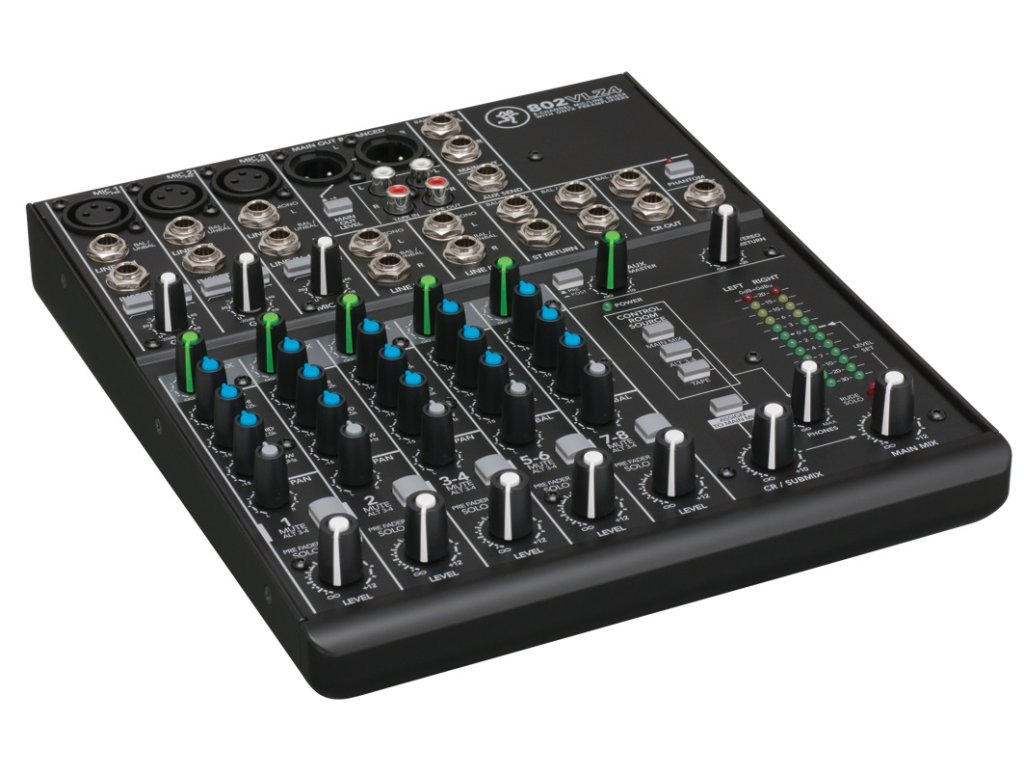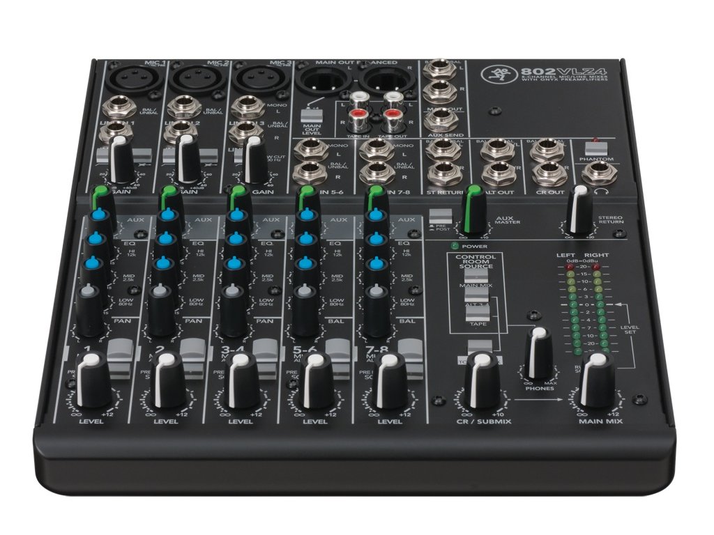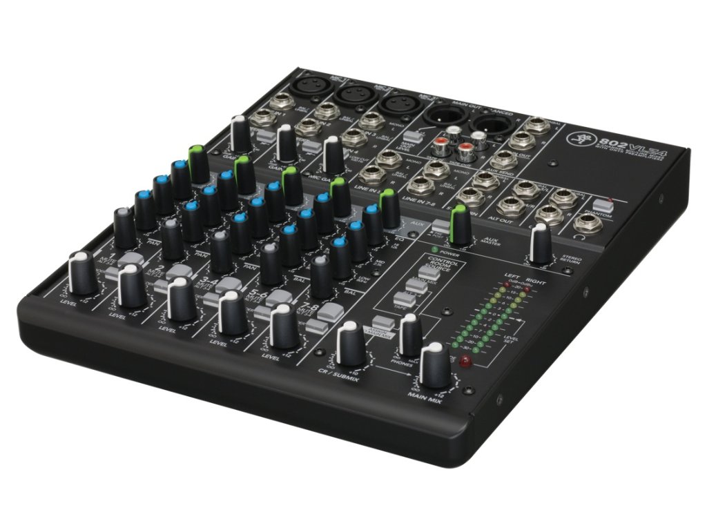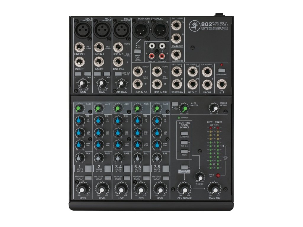 Mackie 802 VLZ4 • 8-kanálový mixážní pult • 3x mono vstupy • 2x stereo páry • 1x stereo return • 1x AUX send • 2x Insert • phantomové napájení 48V • 100Hz Lo Cut filtr na mikrofonních kanálech • rozměry: 273 x 47 x 227 (mm) • hmotnost: 2,5 kg