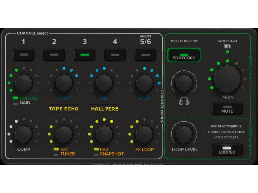 • Vstupy: 3,5 mm Jack AUX IN, Bluetooth, Ethernet, Jack 6,3 mm TRS (2 x), Jack 6,3 mm TS (2 x), Micro SD, Nožní spínač, Return (6,3 mm TRS), USB-C, XLR (2 x)