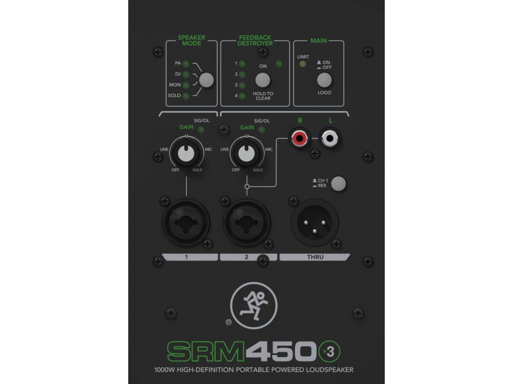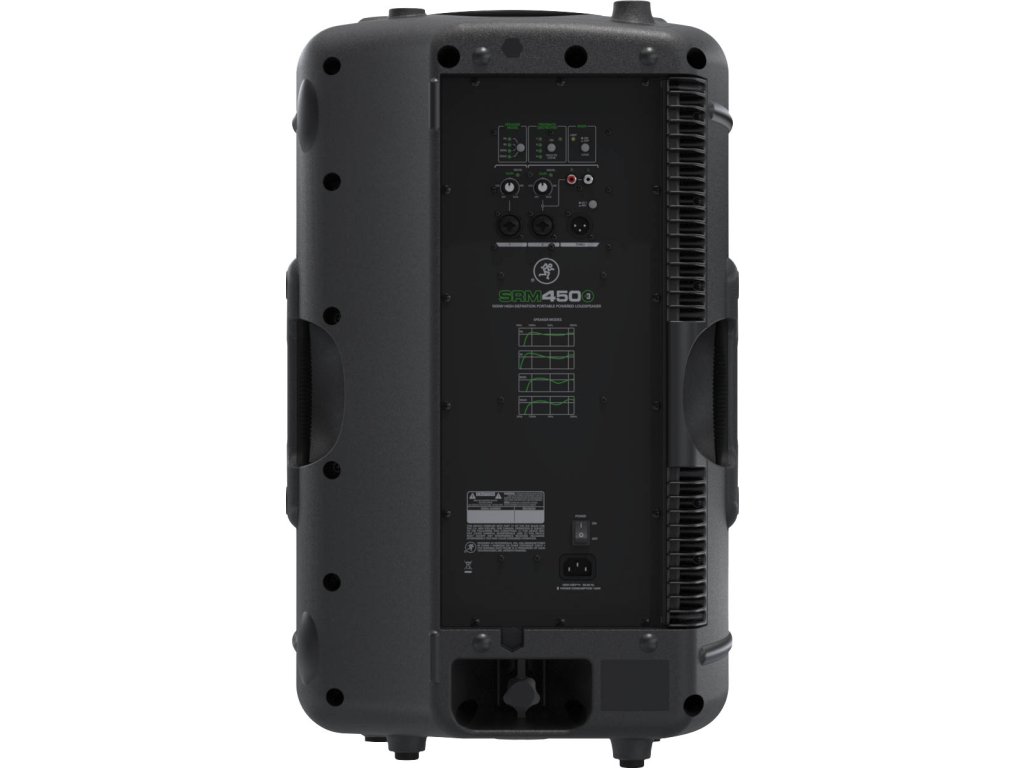 Mackie – SRM450v3 • víceúčelový 2-pásmový aktivní reprobox • série SRM • 1000 W (Peak) • 500 W (RMS) • 12" / 1" • EQ presety PA, DJ, Monitor, SOLO • eliminátor zpětné vazby • XLR, 1/4 "Jack a RCA • hnízdo na stativ • kotvící body • rozměry: 663 x 406 x 376 (mm) • hmotnost: 16,8 kg