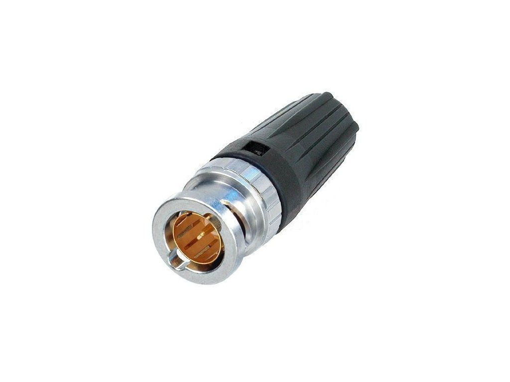 BNC NEUTRIK se zlatým kontaktem. crimp-verse. Rear Twist-Systém pro kabel s maximálním průměrem 7,36mm, vnitřní pin pro 1,6mm vodič. Konektor je vhodný pro aplikce s vysokým rozlišením.