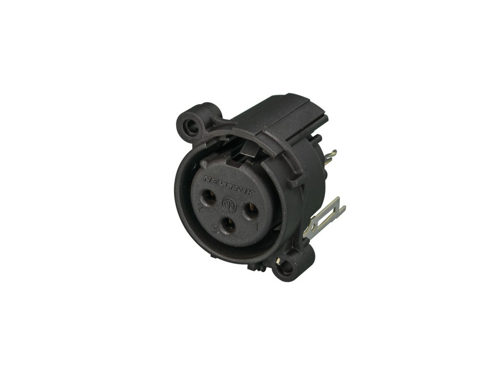 XLR female konektor do panelu, oddělené uzemnění pro konektor a přední panel/šasi, vertikální kontakty, pojistka dodávána zvlášť.
