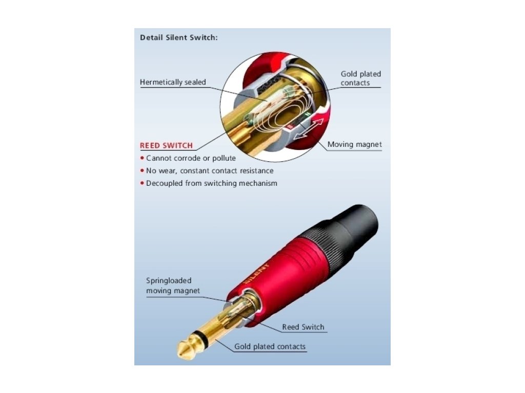 # Special version of 2 pole plug with integrated switch which automatically mutes (shorts) a guitar cable to avoid pops and squeals when changing the guitar under load. The integrated silent switch is based on the REED technology and guarantees a lifetime beyond 10'000 mating cycles.