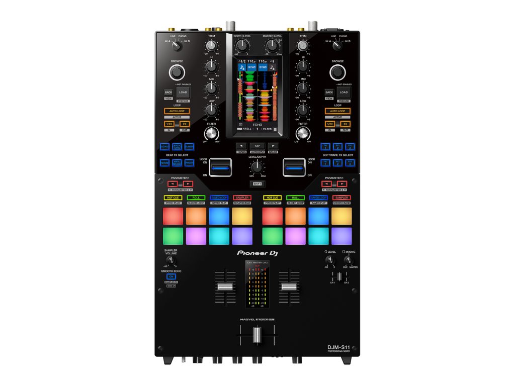 DJM-S11 je další z katalogu battle mixpultů značky Pioneer DJ a je připraven posunout vaše skills na další level. Jedná se o výkonný profesionální dvoukanálový mixpult vhodný pro živá vystoupení i studio. DJM-S11 přináší 16 RGB podsvícených bicích padů, dva kanálové fadery a MAGVEL FADER PRO crossfader s posílenou stabilitou. Hlavní vizuální zpětnou vazbu zajišťuje intuitivní ovládací panel s 4,3“ dotykovým displejem. DJM-S11 má k dispozici až 22 integrovaných efektů s možností uložení až do čtyřech FX bank. Novinkou je také Smootch Echo, které můžete aktivovat pouhým spuštěním daného tlačítka, PADu nebo faderu. Mixpult je také plně kompatibilní se softwary Serato DJ PRO a Rekordbox, jejichž licence jsou součástí balení. Přední strana DJM-S11 se vyznačuje klasickým rozvržením ovládacích prvků pro vstupní a výstupní signál, naleznete zde ovladače hlasitosti pro mikrofonní vstup, dva kanály, spínač Echo či Reverse efektu a duální sluchátkový výstup pro detailní monitoring. Zadní panel nabízí flexibilní konektivitu v podobě stereo RCA In/Out, kombinovaného vstupu pro mikrofon, XLR a linkového výstupu do PA, dvou USB-B výstupů do PC či laptopu a dvou USB-A vstupů pro DJ kontroléry.