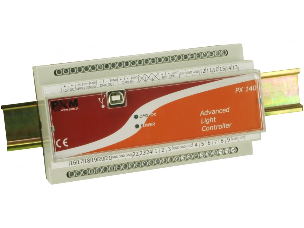 • PX140 modul má 24 vstupů ON/OFF, DMX-512 vstup a výstup a USB portpro komunikaci s okolím.