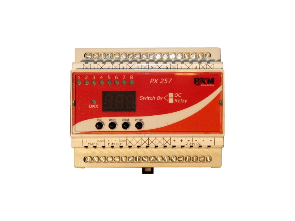 PXM PX257-RELAY • 8 Relay Module • používá se k zapnutí a vypnutí • na jevištní efekty a architektonické osvětlení • pomocí DMX-512 protokolu • modul obsahuje sadu 8 relé s funkcí on / off • umožňuje naprogramovat DMX adresu pro všechny výstupní kanály • nastavit pro ovládání vlastností elektrického motoru • je určen pro montáž na DIN lištu v elektrickém rozvaděči • 105x60x86 (mm) • hmotnost 0,29 kg