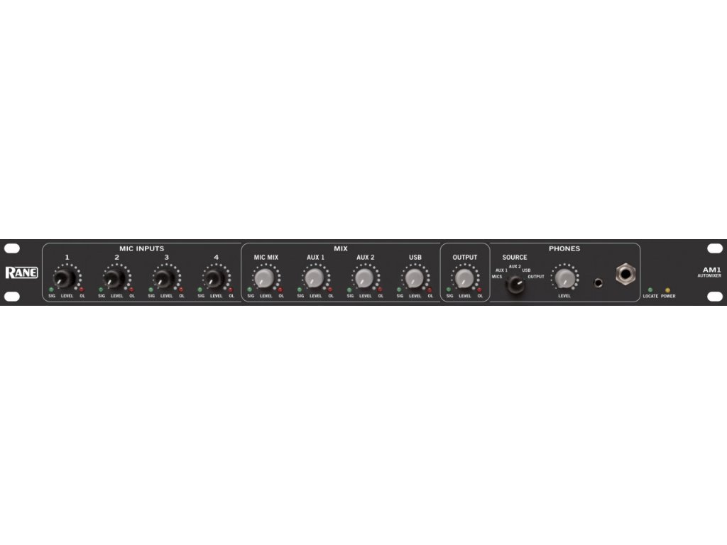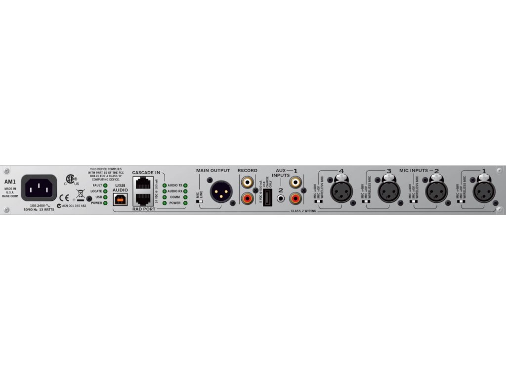 Rane AM-1 je automatický mikrofonní mixažní pult se sdíleným ziskem, manuální linkový mixážní pult, USB audio zařízení a současně Rane RAD (Remote Audio Device) zařízení. AM-1 lze využít jako samostatný mikrofonní/linkový mixážní pult. Pomocí automatického mixážního pultu Rane AM-2, lze přidat další mikrofonní vstupy. Pro přenos hlavního mixu, lze využít port RAD (kabel CAT5) a spojit tak s RAD portem zařízení Rane HAL-1 nebo do Rane Mongoose (CobraNet). Každý ze čtyř XLR mikrofonních vstupů obsahuje ovladač vstupního zisku na čelním panelu a třípolohový přepínač s možnostmi: dynamický mikrofon, kondenzátorový mikrofon s napajením +48V, nebo pro bezdrátové přijímače ( +12 dBV max.). AM-1 je optimalizovaný pro autmatické smíchaní mluveného slova. Mikrofonní vstupy mají pevně nastavený band-pass filter (80 Hz - 7 kHz) pro co možná nejlepší auomatické smíchaní lidského hlasu. Hlavní vlastnosti AM-1 jsou: