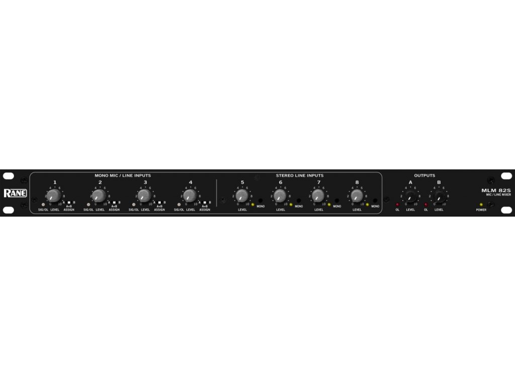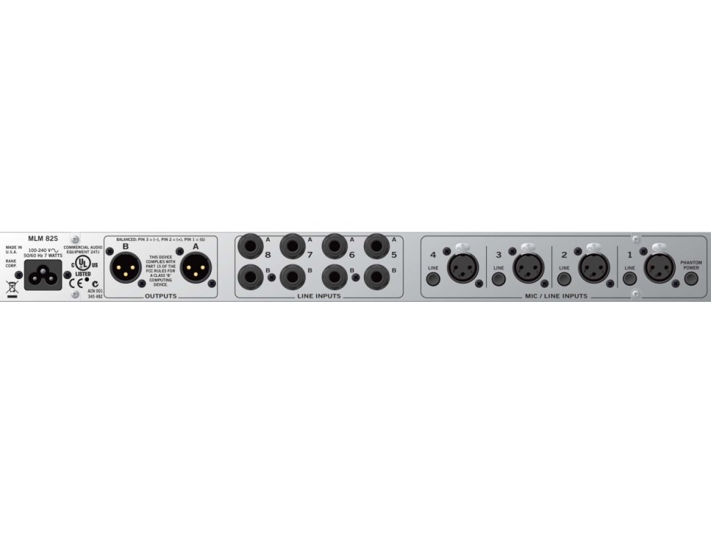 Výstupy A a B mají oddělené ovládání výstupní úrovně, stejně jako oddělené indikátory přebuzení. Při přebuzení je tedy možné buď ztlumit celý mix, nebo pouze ztlumit určitý vstup. Výstupy A a B mají z továrny nastavenou linkovou výstupní úroveň, pomocí vnitřního přepínače je ale možné přepnout výstup i na mikrofonní úroveň. # Rane MLM 82a je vybaven čtyřmi symetrickými, monofoními Mic/Line vstupy na XLR konektorech s 15VDC fantomovým napájením. Mikrofonní předzesilovače jsou studiové kvality. Každý ze čtyř mic/line vstupů může být přiřazen na výstup A, A+B, B. Nezávislé ovládání úrovně každého kanálu a kontorlky přebuzení jsou k dispozici pro každý vstup. Přepínače fantomu a mic/line jsou na zadním panelu. Pokud je vstup v módu line je fantomové napájení automaticky vyřazeno.