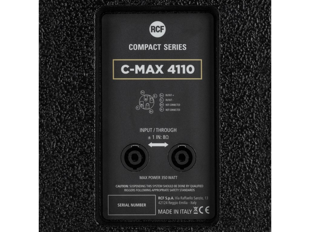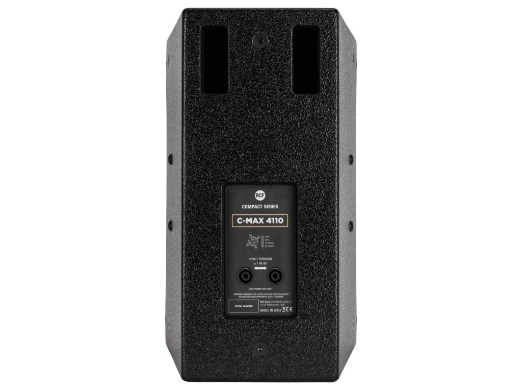 Pasivní fullrange RCF C MAX 4110 je speciálně navržený reprobox pro instalace v klubech a dalších zábavních podnicích a přináší kvalitní přednes, koherentní vokály a stabilní akustický tlak při vysokých hlasitostech. Je osazen 10‘‘ wooferem 1‘‘ driverem. Pasivní řada C MAX svými parametry plnohodnotně rozšiřuje řadu COMPACT. Bassreflex naleznete na zadní straně boxu a díky důmyslnému ladění rozšiřuje spodní frekvence i při montáži blízko stěny. C MAX 4110 se hodí pro AV instalace, Karaoke bary, konferenční místnosti a veřejná prostranství a tanečních klubů.